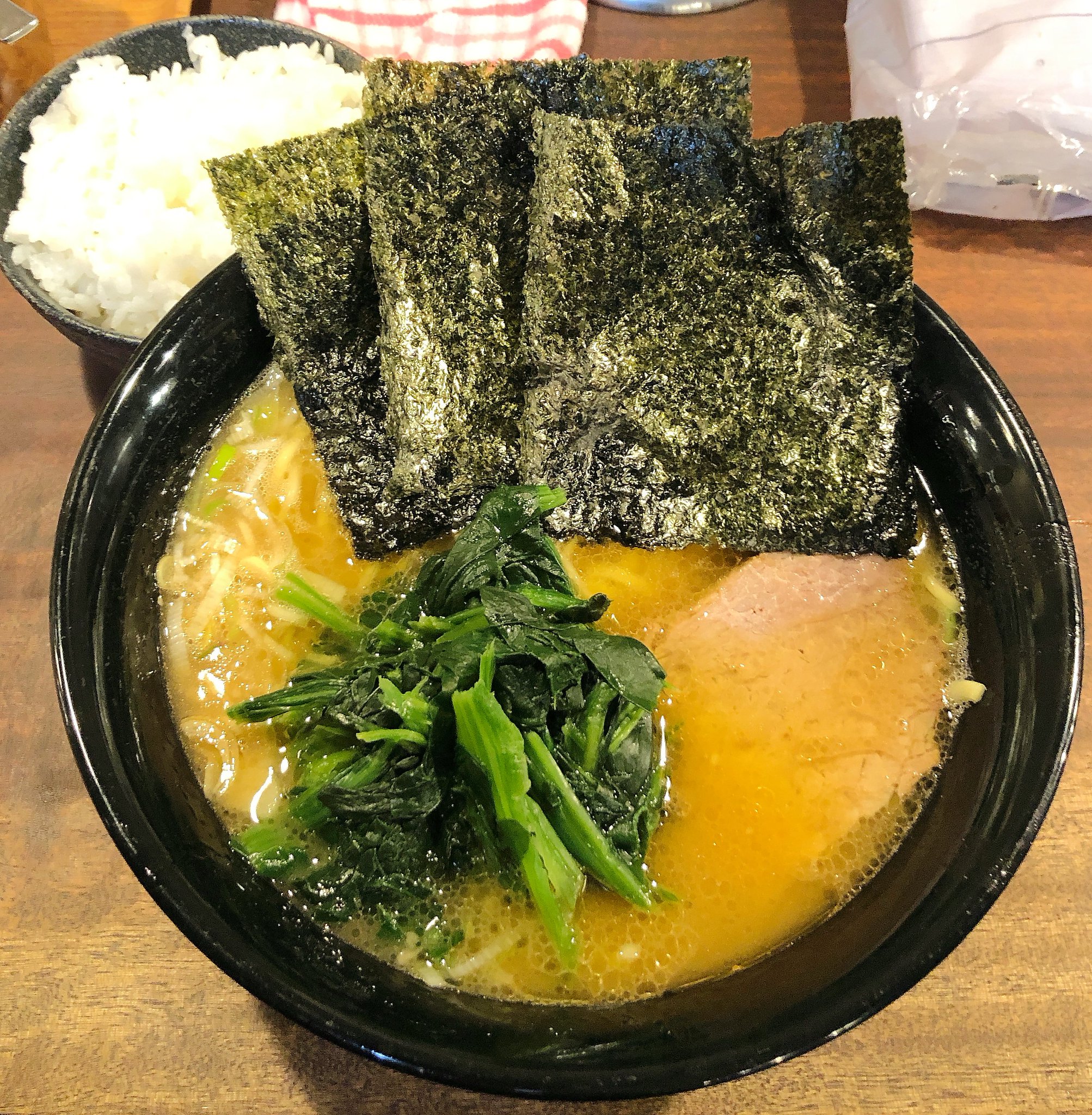 ラーメンはすぐに出てきました。スープを飲んでみると濃厚な醤油豚骨です。麺は明らかにかためと感じました。ほうれん草多め、チャーシューは大きなものが2種類も入っていました。海苔がふやけそうになったので早めにライスを巻いて食べました。