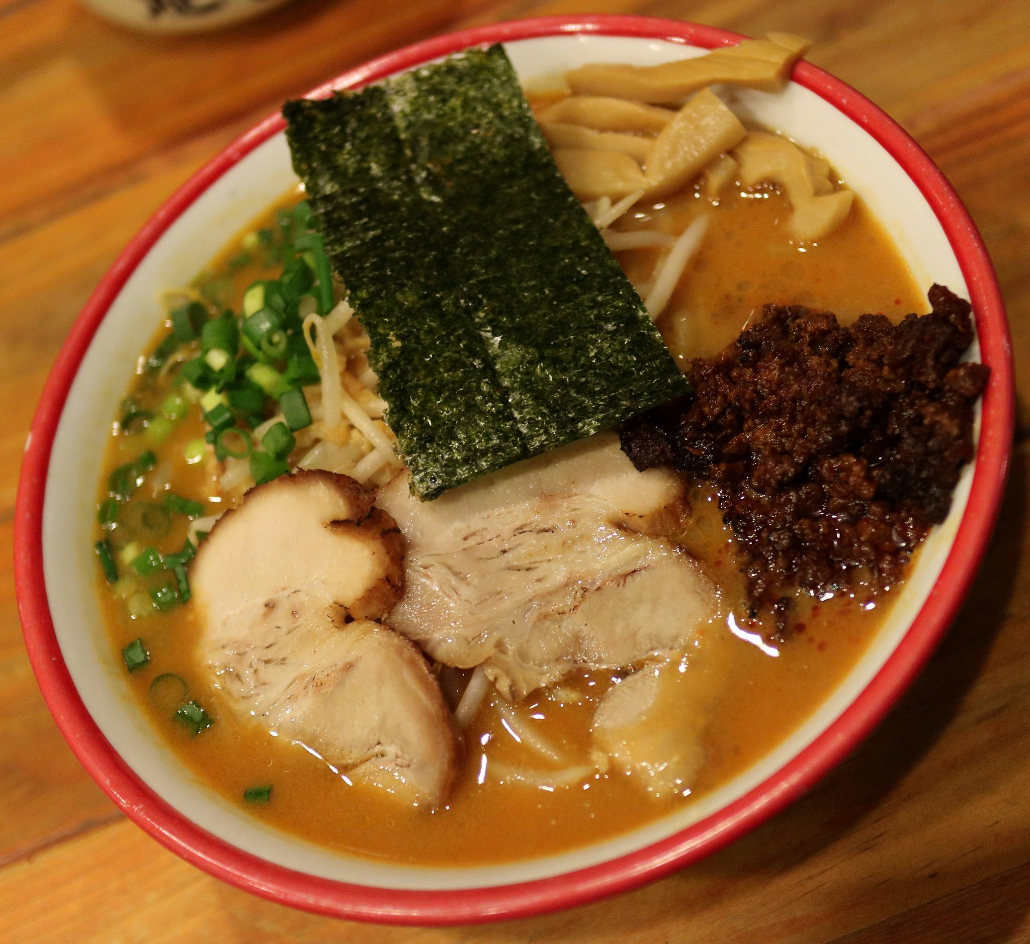 ------ 万能 ------ スープを飲んでみると魚介系のダシが効いたスープでした。しかしやや薄めで物足りなさを感じました。しかし麺はコシのあるストレート麺で美味しく、シナチクのシャキシャキ感が最高でした。大きなチャーシューに味玉が丸ごと1個入っていました。半分だけかじってみると半熟具合が最高な玉子でした。 最初は薄く感じたスープも徐々に慣れてきて、最後はこれもありかなと思うほどでした。途中で万能を少し入れてみましたがあまり味が変わることもありませんでした。 管理人評価:★★★★☆ |
