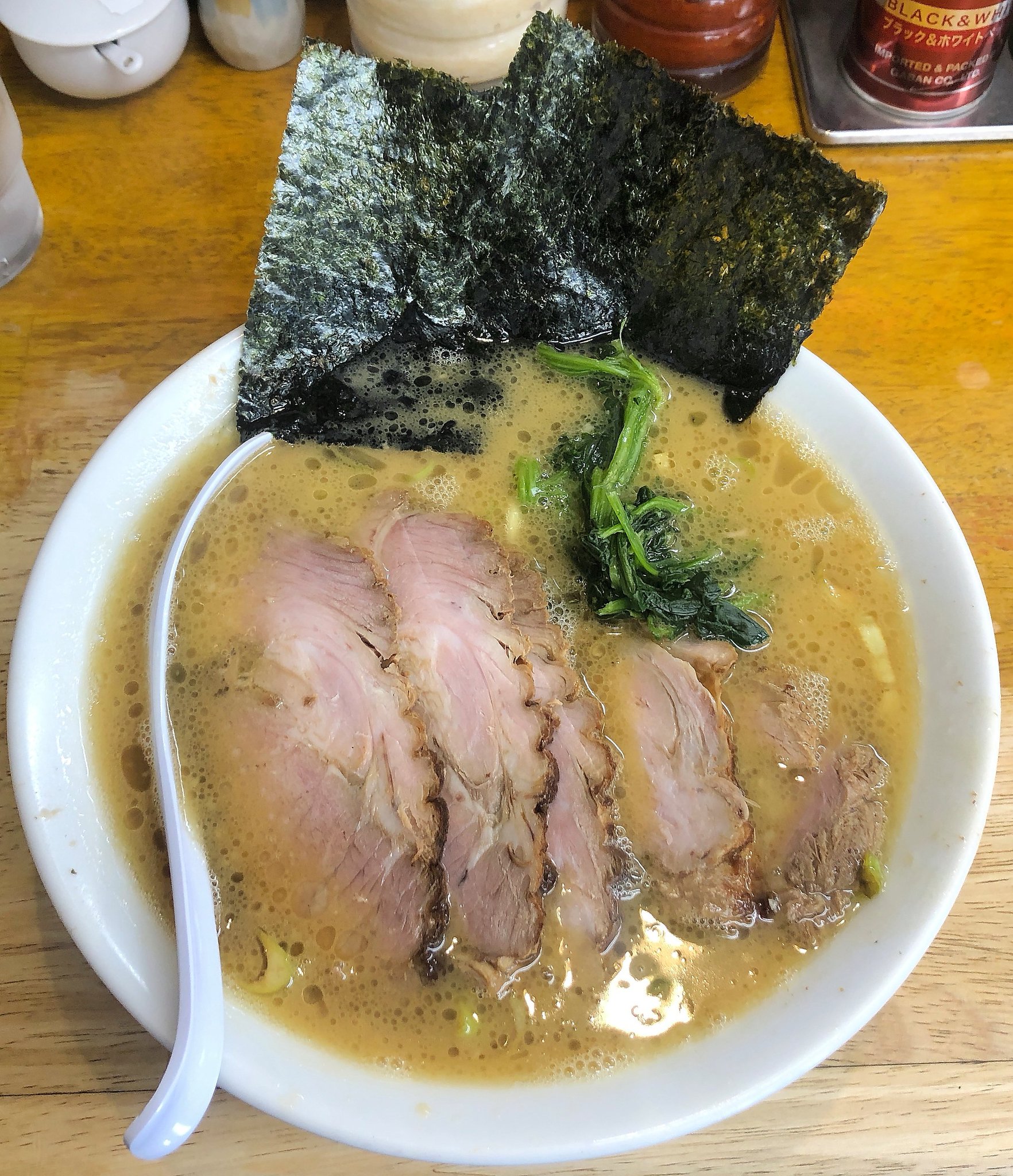 海苔をスープの中に沈み込ませてからスープを飲みます。家系とは違った味の豚骨醤油スープです。