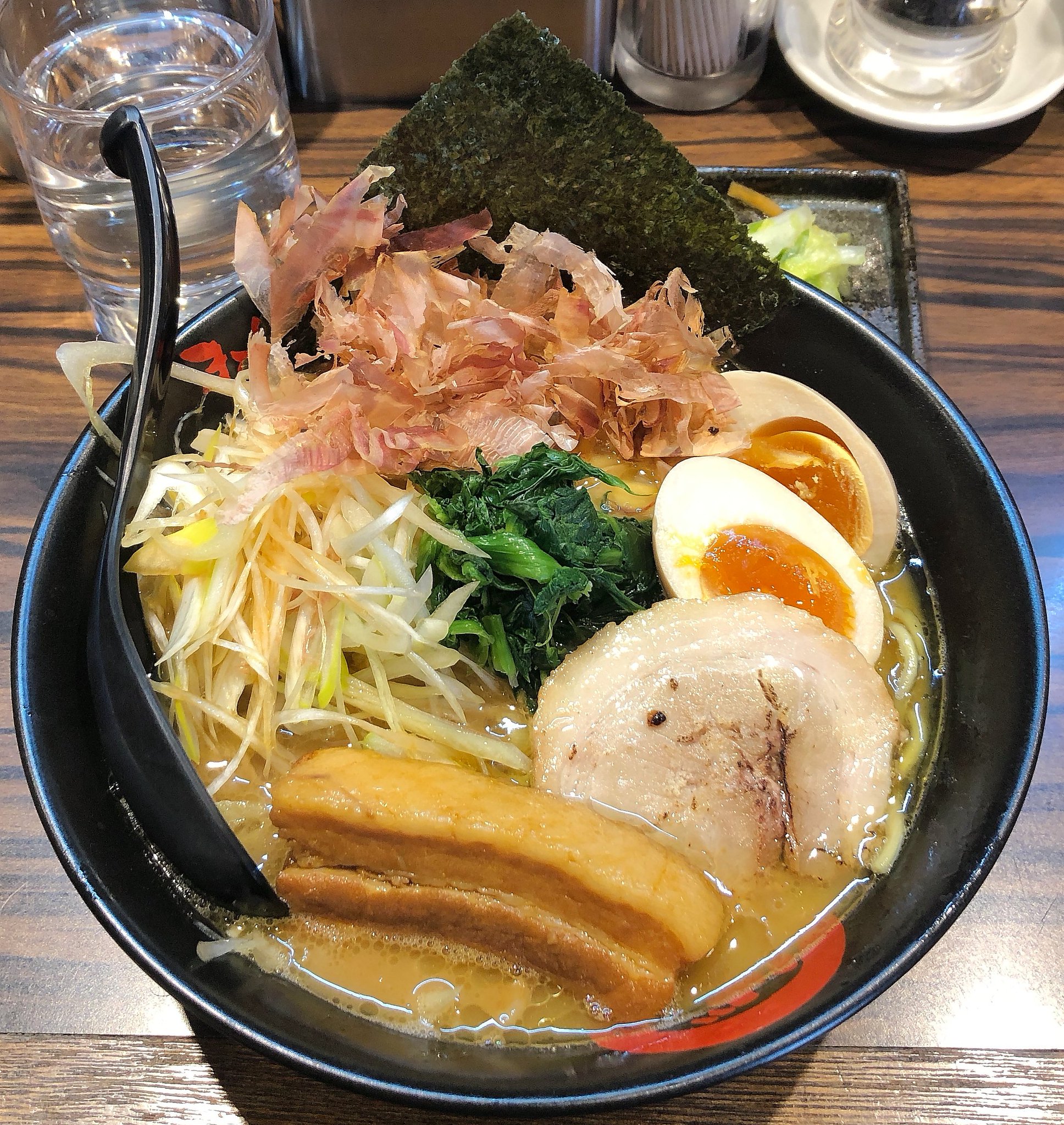 スープを飲んでみると、まろやかな豚骨醤油味のスープでした。あんまりコッテリ感はなくてサッパリしているのですが、それでいて物足りなさ感はなく満足できる味のスープでした。麺は太めでコシがあって良かったです。老人や女性も多かったのがうなずけます。ご飯は欲しいとは思いませんでした。