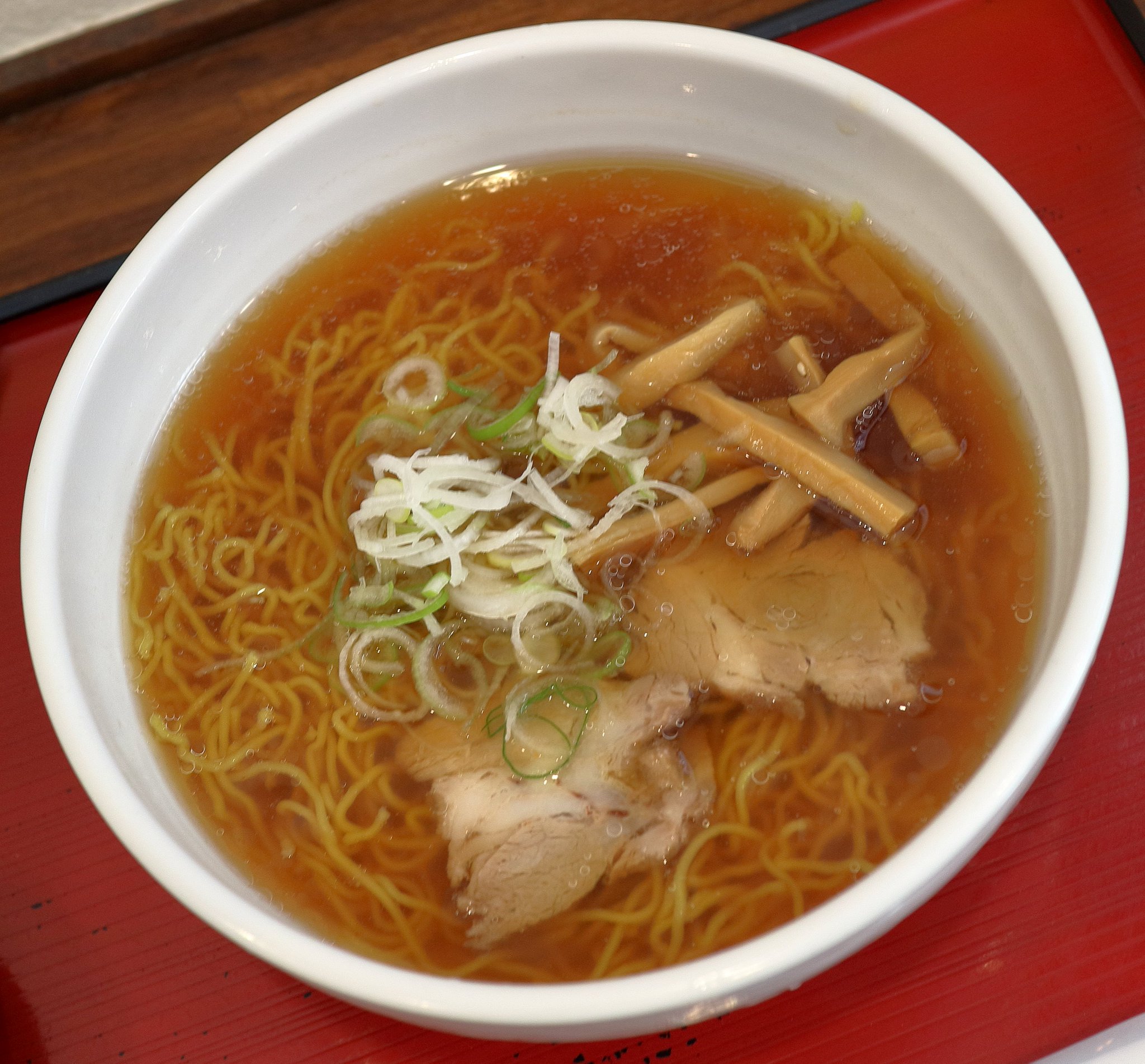 そして出てきたラーメンが写真のような感じのラーメンです。サッパリしていそうな醤油ラーメンでした。実際にスープを飲んでみると美味しい醤油味のスープでした。麺は細い縮れ麺で喉越しがいい感じでした。麺メンマ、チャーシュー、ネギが入っていました。本当にあっさりした淡麗系のラーメンですっきりしました。
