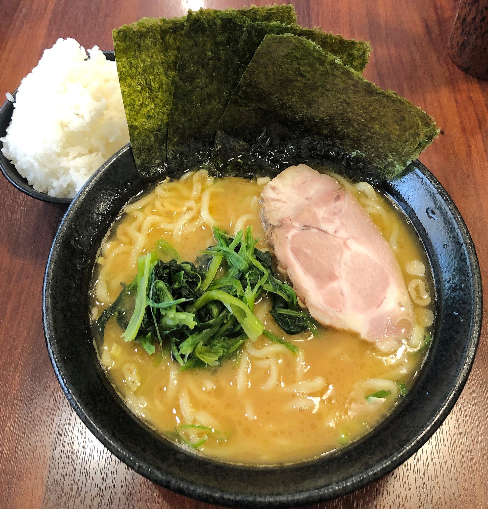 海苔をスープの中に沈み込ませてチャーシューを麺の下に挿入してからスープを飲みます。醤油のしょっぱさを感じる豚骨醤油味のスープでした。麺は極太で柔らかい感じでした。ブヨブヨしている感じです。シャキシャキのほうれん草、とちゅうから海苔でライスを巻いて食べましたが、ライスが熱いので口の中が火傷しそうになりました。ラーメンのナイスはやや冷たいくらいがいいのかもしれませんね。