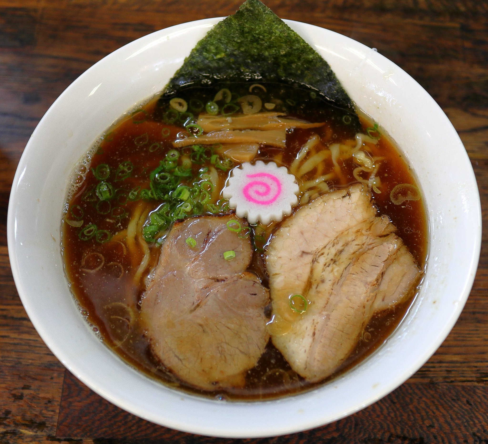 そして私のラーメンが出てきました。器が通常より一回り大きいように感じました。控えめな海苔が良かったです。スープは醤油味で油(ラード?)の膜があってコクがありました。麺は中太縮れ麺でスープが絡みすぎるくらいでした。チャーシュー中華そばなのでもちろんチャーシューが沢山入っていましたがこれも美味しかったです。色々な野菜が入っていて新鮮な味わいが印象的でした。