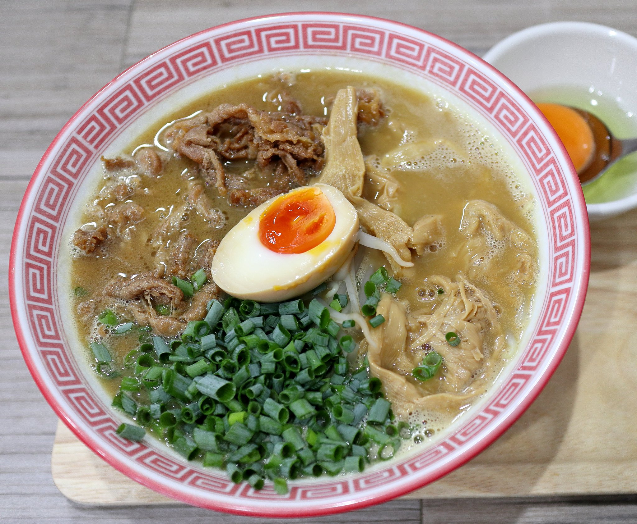 そして出てきたラーメンが写真のような感じになります。生卵が別皿にあって、更に煮玉子がラーメンの中央に鎮座していました。