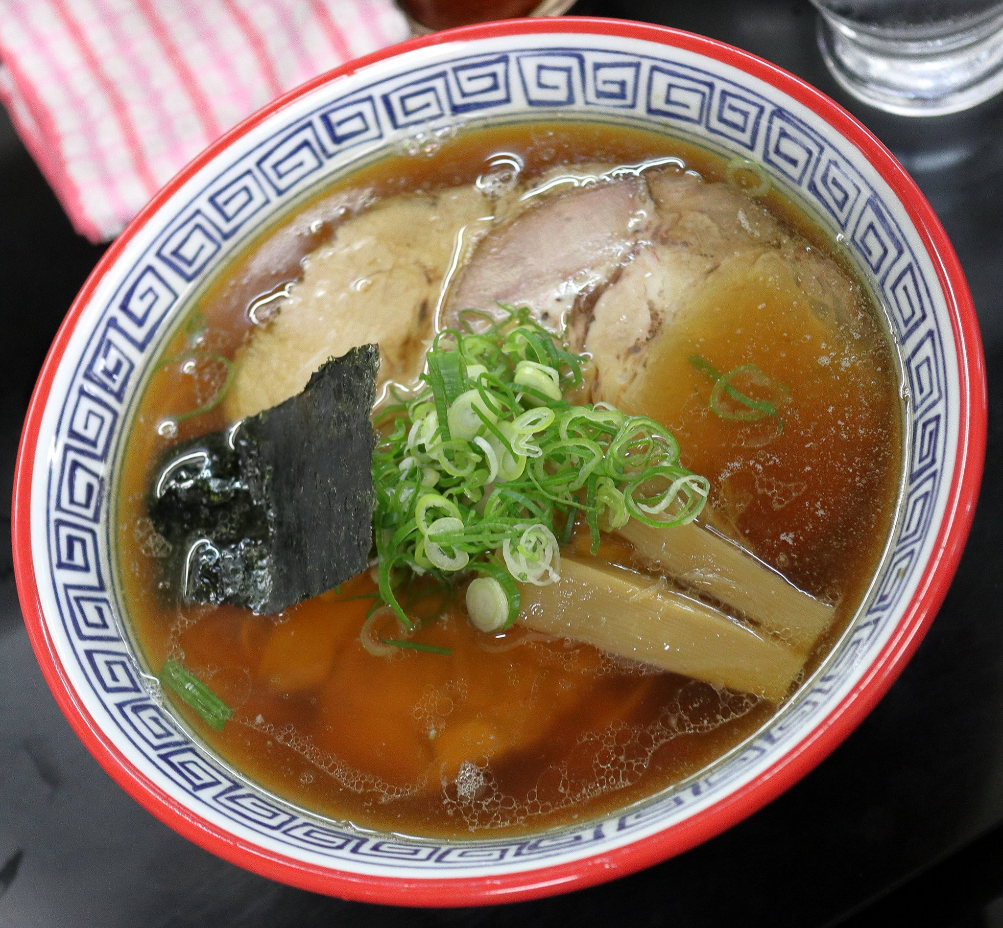 2008年08月12日 今日はジョニー氏が不在だったので、最上の豚八君とマリン君と3人で出かけました。辻堂のめんめん亭にしようかと思ったのですが少し遠かったのでら塾に決めました。ら塾の周辺は駐車場が沢山あるので車で近くまで乗り入れることができました。お昼過ぎでしたが先客はなし。私はチャーシューメン:1030円(上の写真左)、マリン君と豚八君は塩チャーシューメン:1030円(上の写真右)の食券を購入しました。店員のおじいさんが、クーラーが効く席を教えてくれたのでそこを陣取りました。ここは麺をゆでる時間が短いのでラーメンがすぐに出てきます。今回は塩チャーシューが先に出てきて、その後私のチャーシューメンを作っていました。麺は他の人のラーメンの麺と混ざらないようにしながらゆでていました。大きなチャーシューが印象的で、海苔、ネギ、メンマなどが入っていました。スープを飲んでみると見た目はさっぱりしていそうですが意外と脂っぽくておいしいです。前も書きましたがここの麺はスープがよく絡んで、麺をすするとまるで踊り食いをしているような食感です。それにチャーシューがおいしいです。でも新鮮味がなかったので満点ではありませんでした。マリン君曰く、もともとこってり系が好みなのでスープが脂っぽかったのは良かったが麺が好みではなかったようでした。マリン君と豚八君そろってチャーシューがおいしかったとのことでした。 |