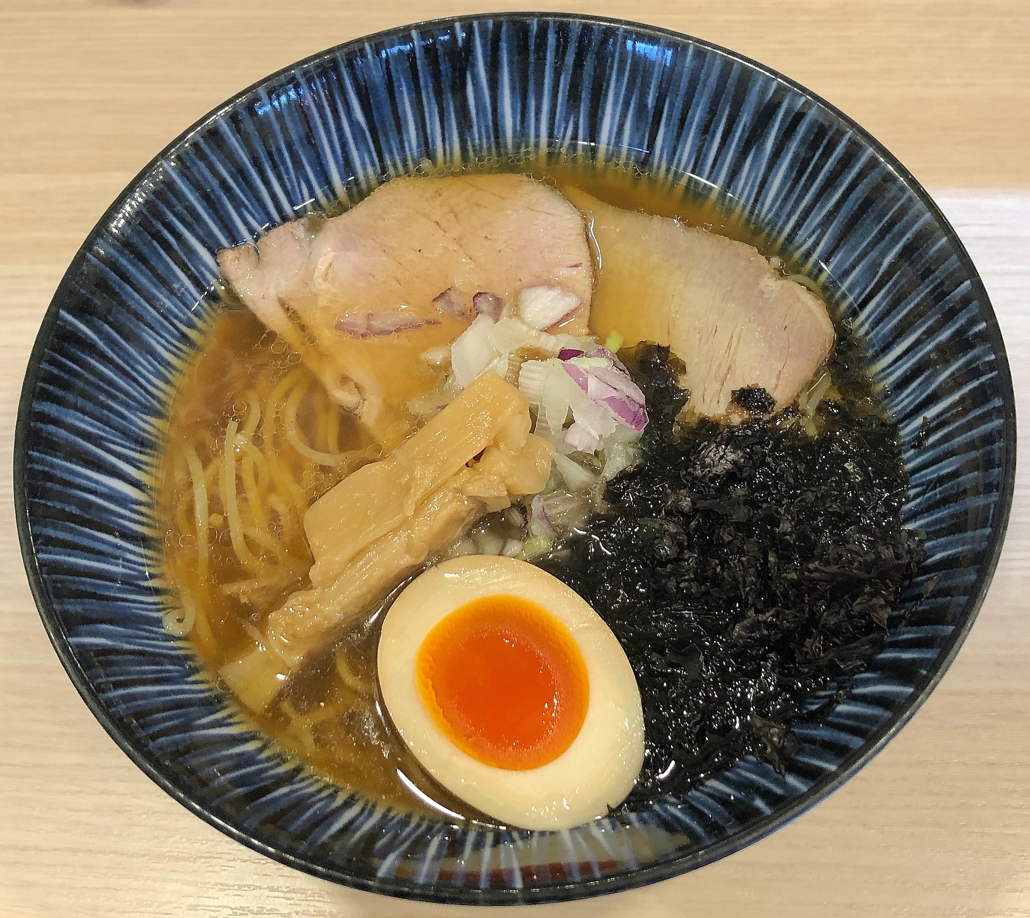 ラーメンは煮干しの香りが良く、スープはサッパリとした醤油味。麺は普通。太いシナチク、煮玉子、チャーシュー2枚、それに岩海苔も香りが良くて煮干しラーメンに良く合いました。