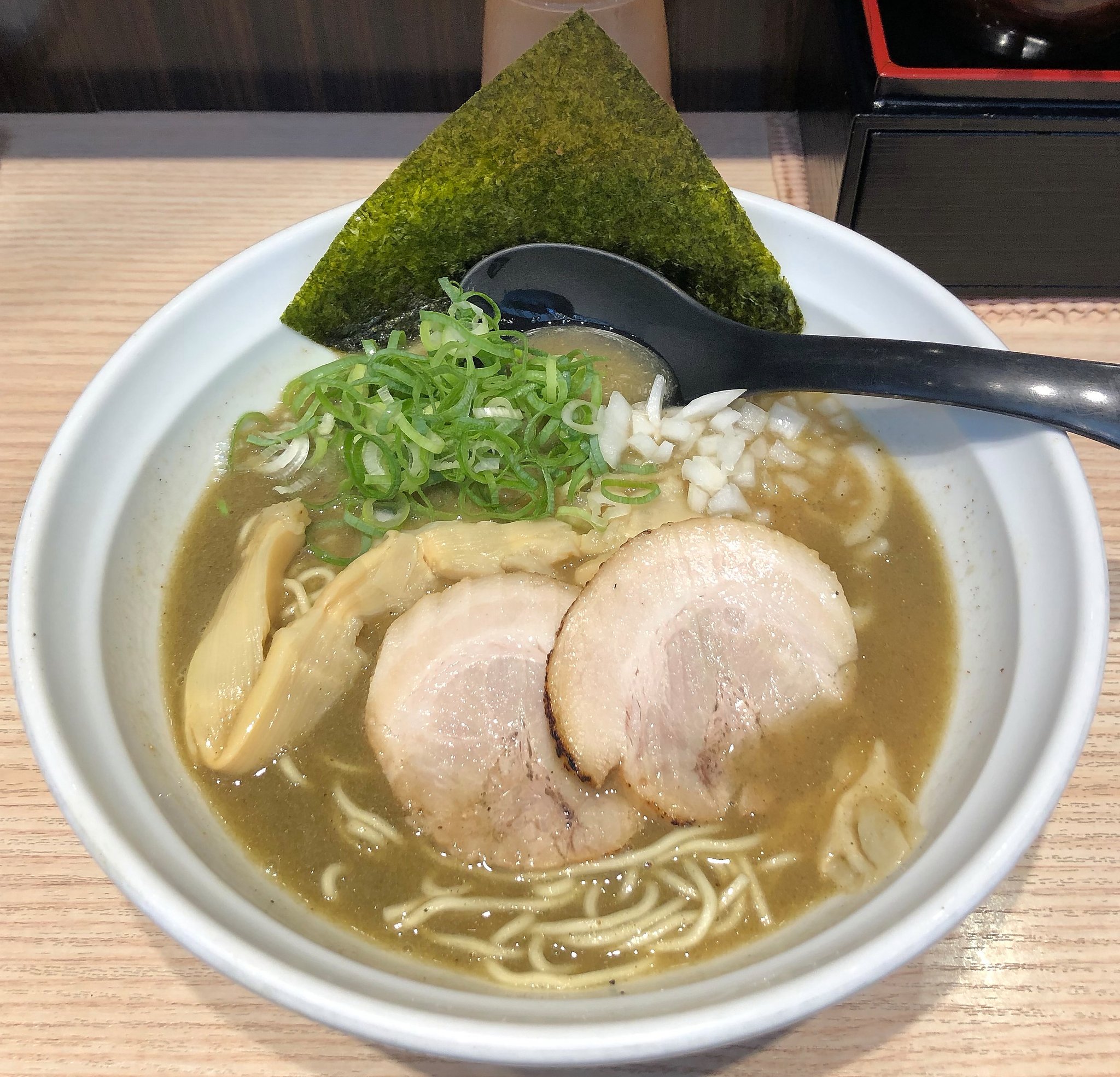 普通に待ってラーメンが出てきました。スープを飲んでみると美味しい煮干しスープでした。麺はやや細めのストレートで噛み応えが素晴らしかったです。シナチクが大きくて驚いたのですがこれがもう1本入っていました。チャーシューは小さめのジューシーなものが2個入っていて美味しかったです。