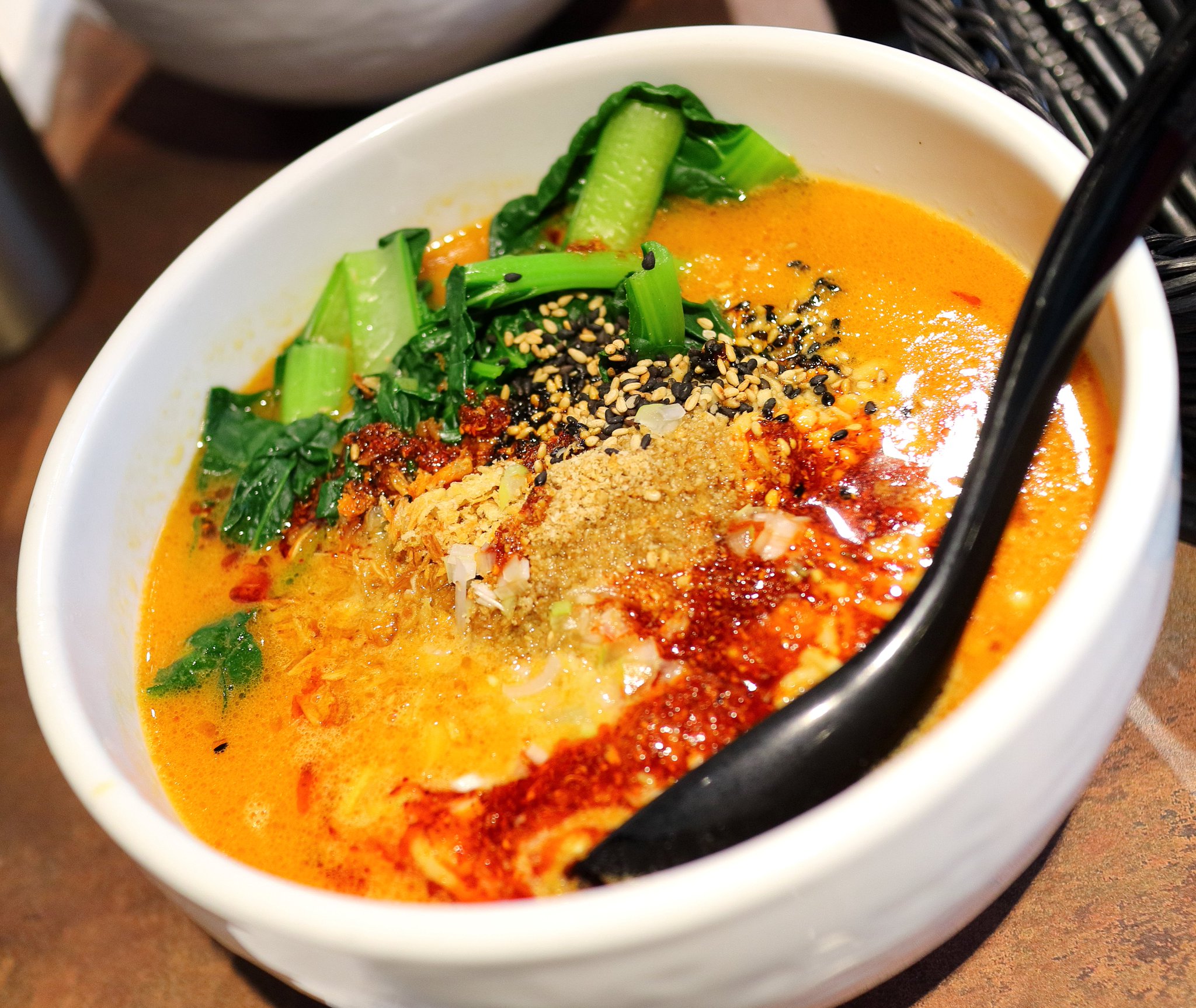 そしてラーメンが出てきました。4人共紙エプロンを装着してから写真を撮ってラーメンに取り掛かりました。私の麻辣担々麺は山椒が効いていて舌がしびれてしまいました。辛さよりもしびれ感が凄かったです。麺は中太麺で噛み応えの良い麺でした。夜桜おせんもしびれていました。その後普通の水を飲んでも舌のしびれを感じるくらいの刺激の強さでした。レイクちゃん曰く「アジアの味がする」とのことでした。亀戸君も高評価だったようです。 レイクちゃん評価:★★★★★ 夜桜おせん評価:聞き忘れました 亀戸君評価:★★★★★ 管理人評価:★★★★☆