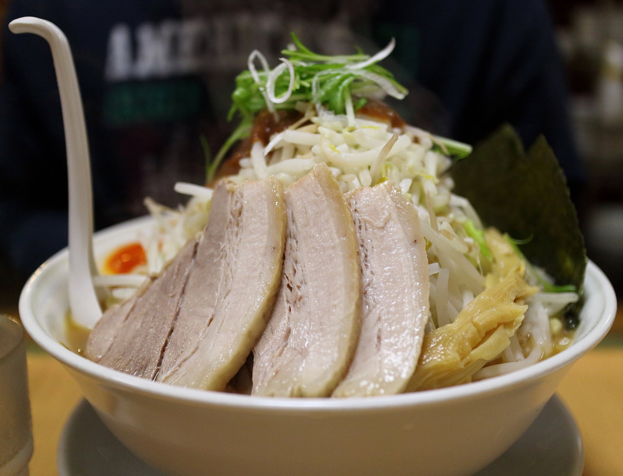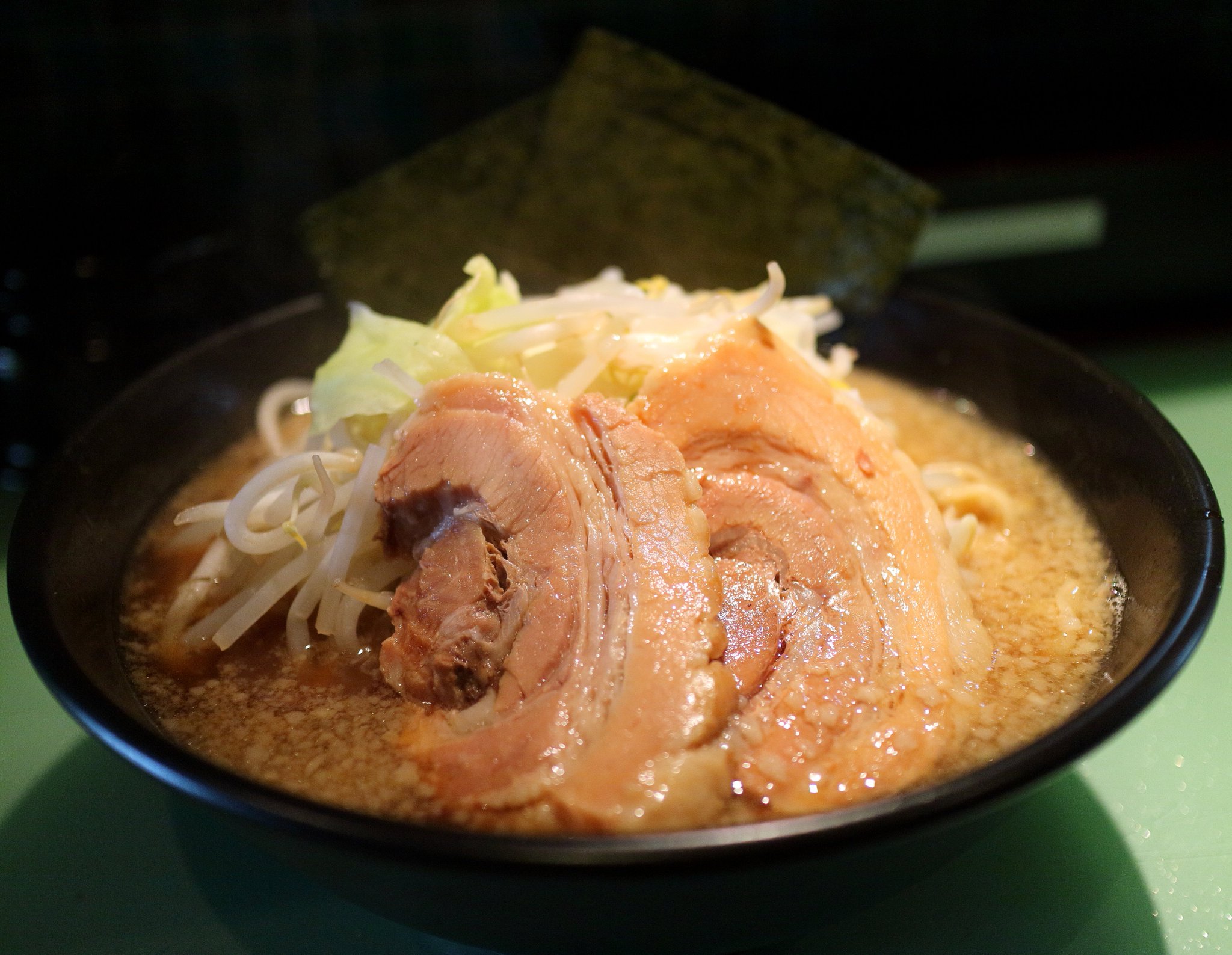 二郎系のラーメンは大量のモヤシで麺を食べる前に満腹になってしまうのですが、今回の野菜なしラーメンというメニューの発想は素晴らしいですね。私は野菜は不要です。野菜(しかもモヤシ)で量を誤魔化すようなことはして欲しくないと前々から思っていたのです。 そしてラーメンが出てきました。大きくて分厚いチャーシューが凄かったです。麺を引き出して野菜と入れ替えてみるとビラビラ状態の平打ち麺?のような感じでした。ゴワゴワ感はありませんでしたが食べ応えのある麺でした。200gの麺だったのでそんなに大量ではないはずでしたが途中でちょっときつくなってしまいました。 食べ終えてみればちょうどいい満腹感で満足できたのでした。 |
