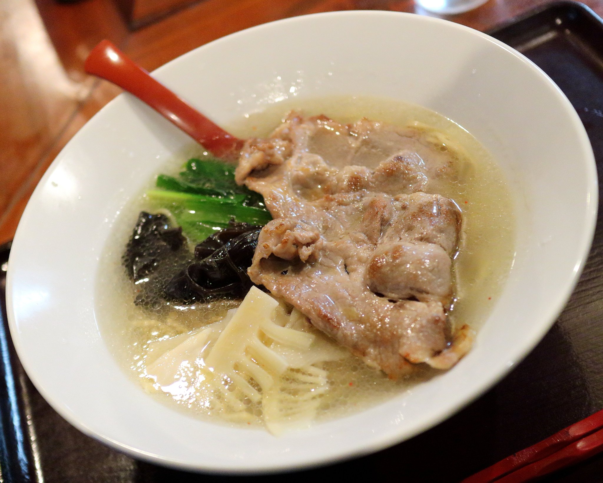 厨房を見ていると2杯ずつ作っているようで同じ種類のスープ毎に作っているようでした。そして私の塩中華そばが出てきました。美しいラーメンでした。スープを飲んでみると美味しい塩味のスープで煮干しの風味を感じることができました。濃厚といった感じではないのですが逆に煮干しの変な臭みは全く感じることなく絶妙のバランスだと思いました。 是非別のメニューも食べてみたいと思いました。 |