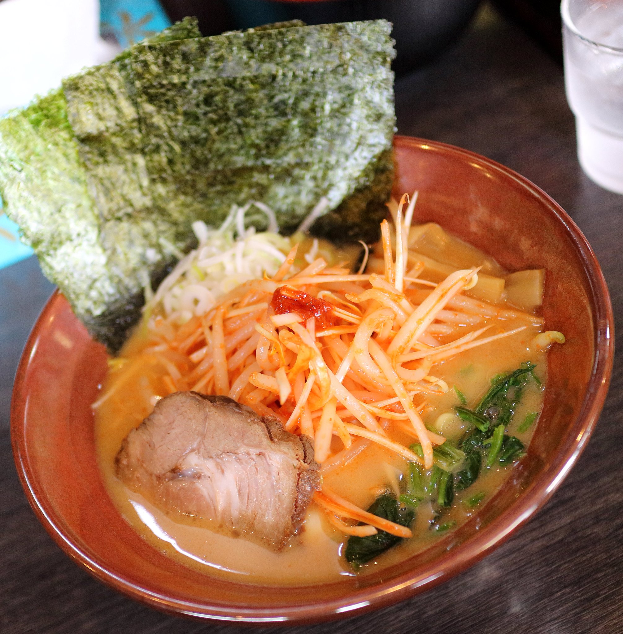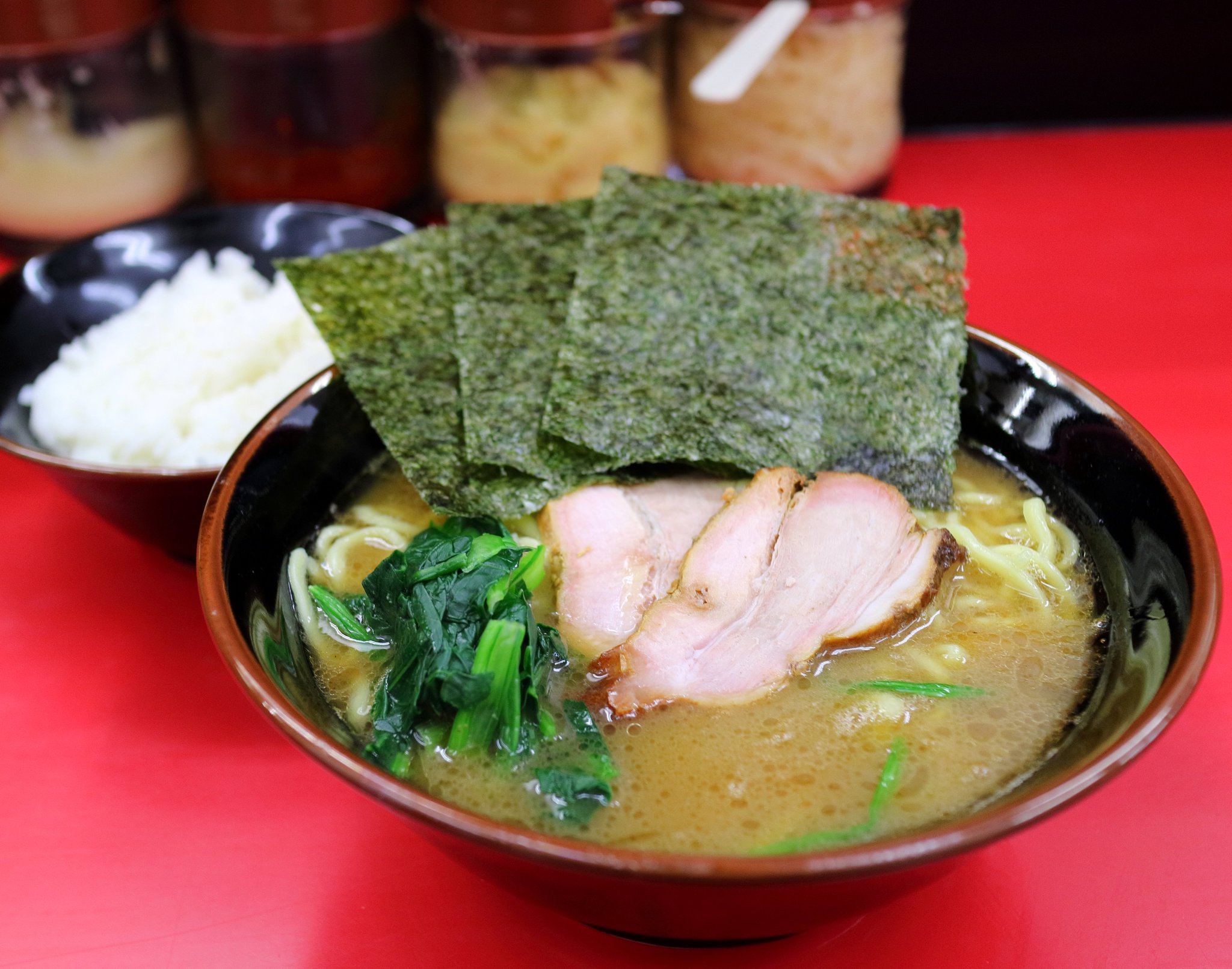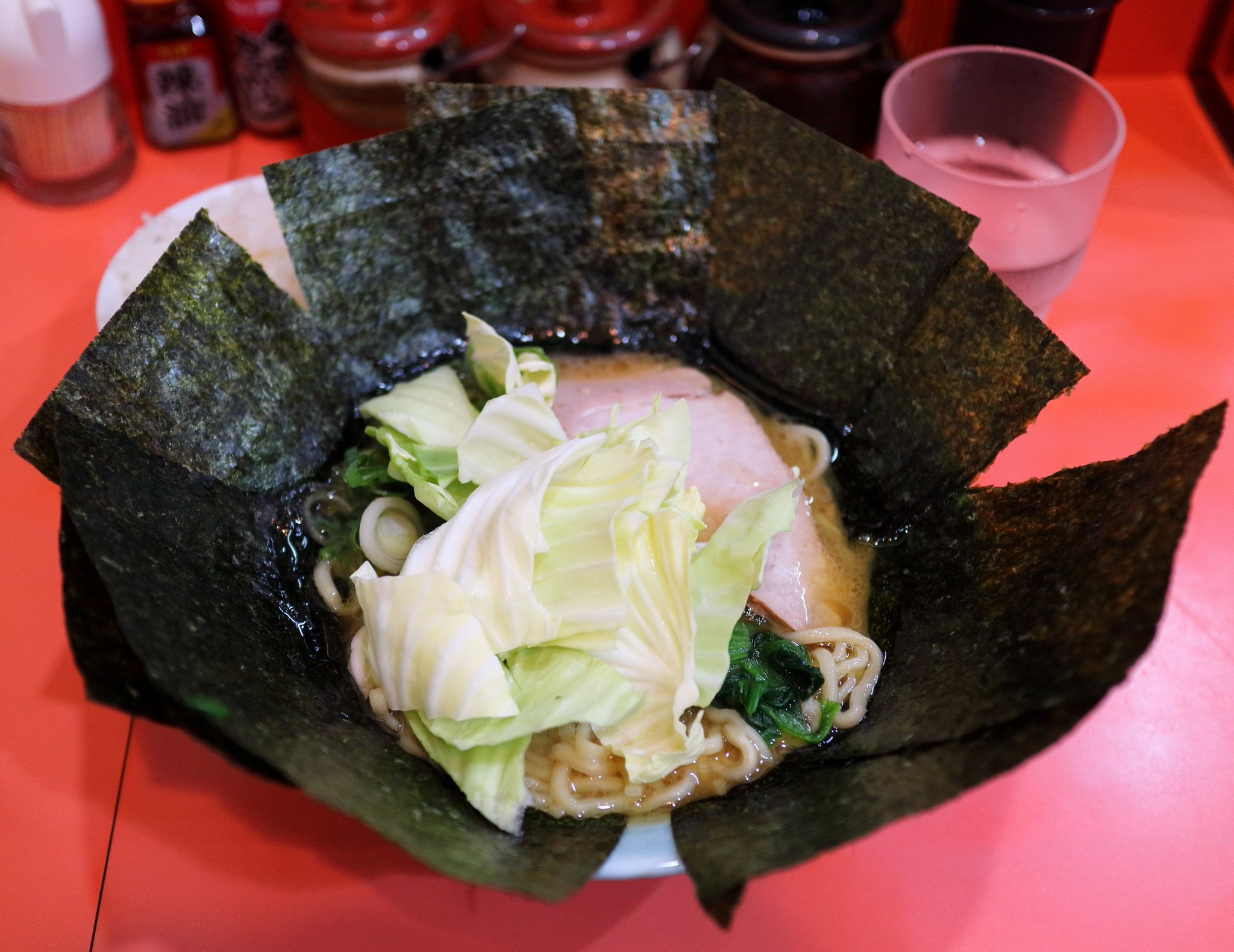 店内はお客さんが沢山入っていましたが空き席はありました。券売機でラーメン:700円とライス:50円の食券を買って席に座りました。すると店主から少し待つよう言われました。ひと段落したところで好みを聞かれたので麺かためでお願いしました。そしてラーメンが出てきました。 海苔がチャーシューの上に浮いているのでまずはこの海苔をスープの中に沈みこませます。そしてスープを飲みます。以前から感じていたことですがこのお店のスープは一番吉村家のラーメンのスープに近いように思います。吉村家の味は私は好きなので嬉しくなります。それからおろし生姜がおいてあるのも素晴らしいです。最初はそのまま食べましたが、後半はこのおろし生姜を投入して食べました。 麺を食べ終えそうになってから海苔でライスを巻いて食べましたがブラックペッパーが無かったのが残念でした。 |