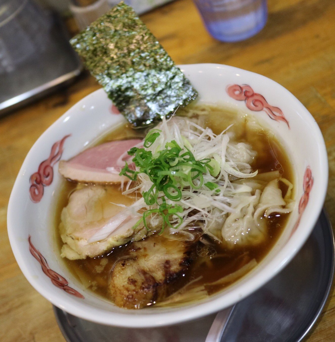 その後すぐに店内に案内されました。私はすぐに「コラボのやつ」と注文しました。作り方を見ていると普通のものとは麺も違っていました。それからワンタン3つ、チャーシューが3種類も入っていました。スープを飲んでみると美味しい醤油味のスープです。麺は佐野ラーメンの麺をもっとしっかりさせたような感じでした。平打ち縮れ麺でしょうか。長いシナチク。そして3種類のチャーシューは素晴らしかったです。麺を食べ終えた後もスープをゴクゴクと飲んでしまいました。 管理人評価:★★★★★ |