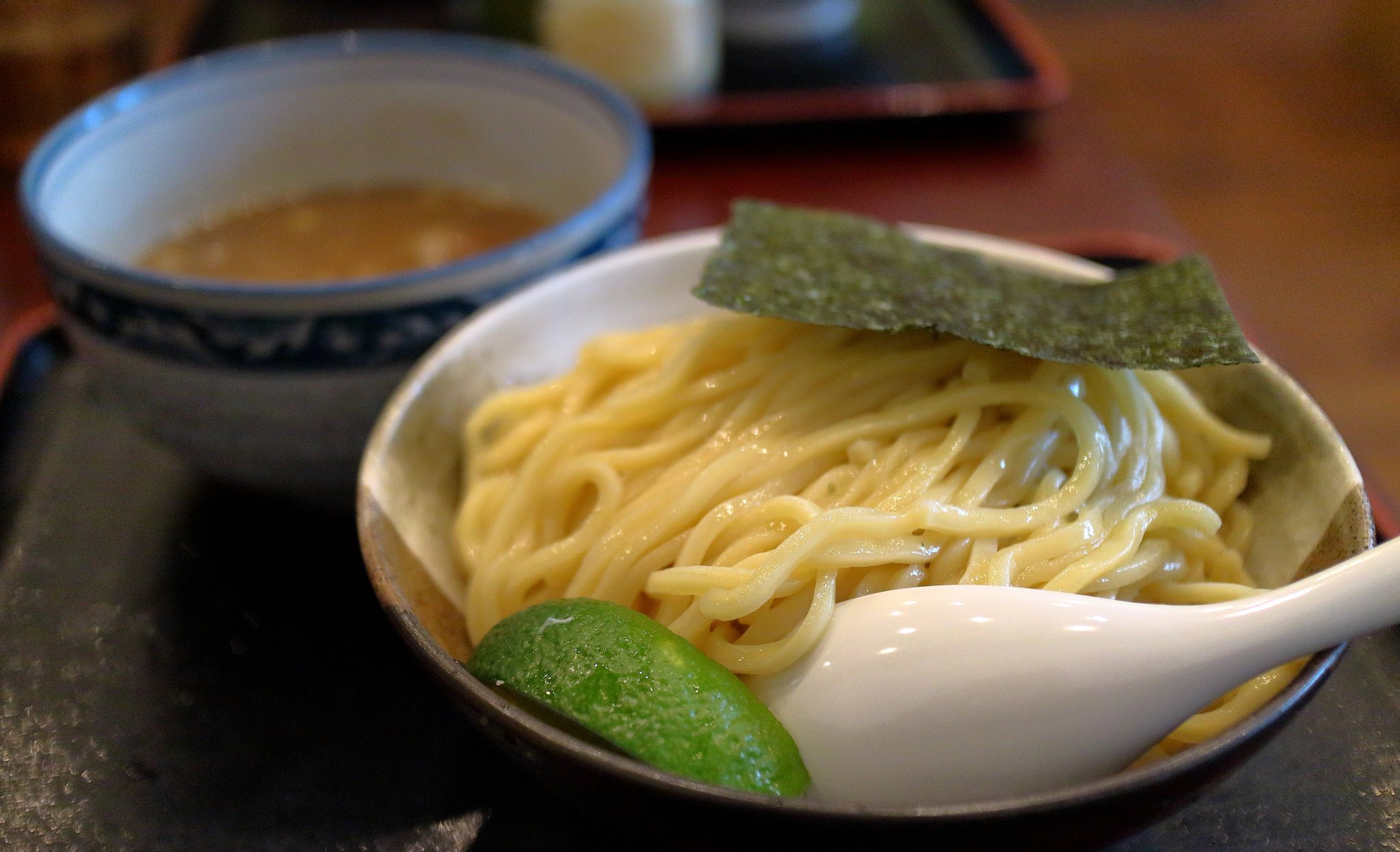 麺の上には海苔とレモン?、スープには大きな具はありません。私の好きなつけ麺スタイルです。つけ麺のスープの中や麺の上にいろいろな具が乗っているとどうやって処理していけばいいのか困ってしまうのです。レモン?を絞ってスープにかけました。そして麺をスープにつけて食べます。コシのある極太麺に濃厚魚介豚骨スープがよく合います。麺の量も300gでちょうど良い感じでした。 麺を食べ終えた後はテーブルに置いてある割スープを入れて楽しんだのでした。 バルボレーション評価:★★★★☆ 管理人評価:★★★★☆ |