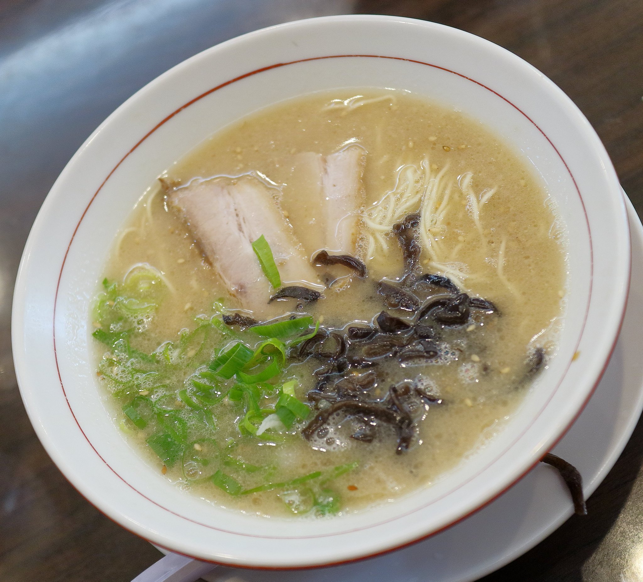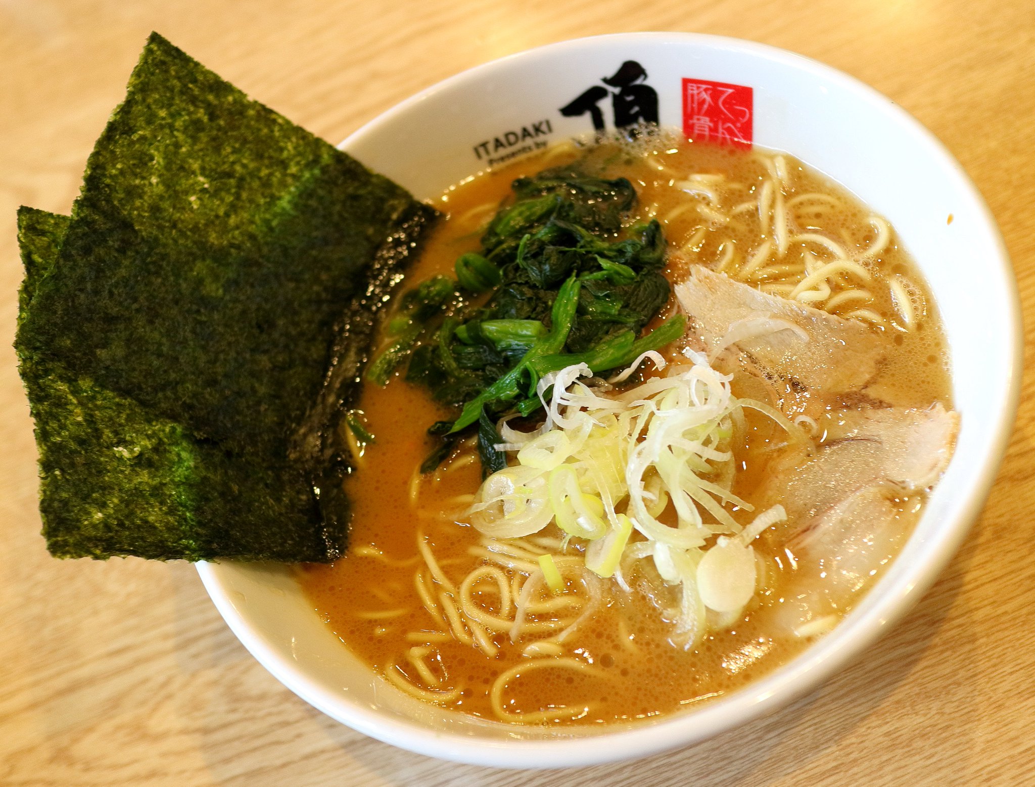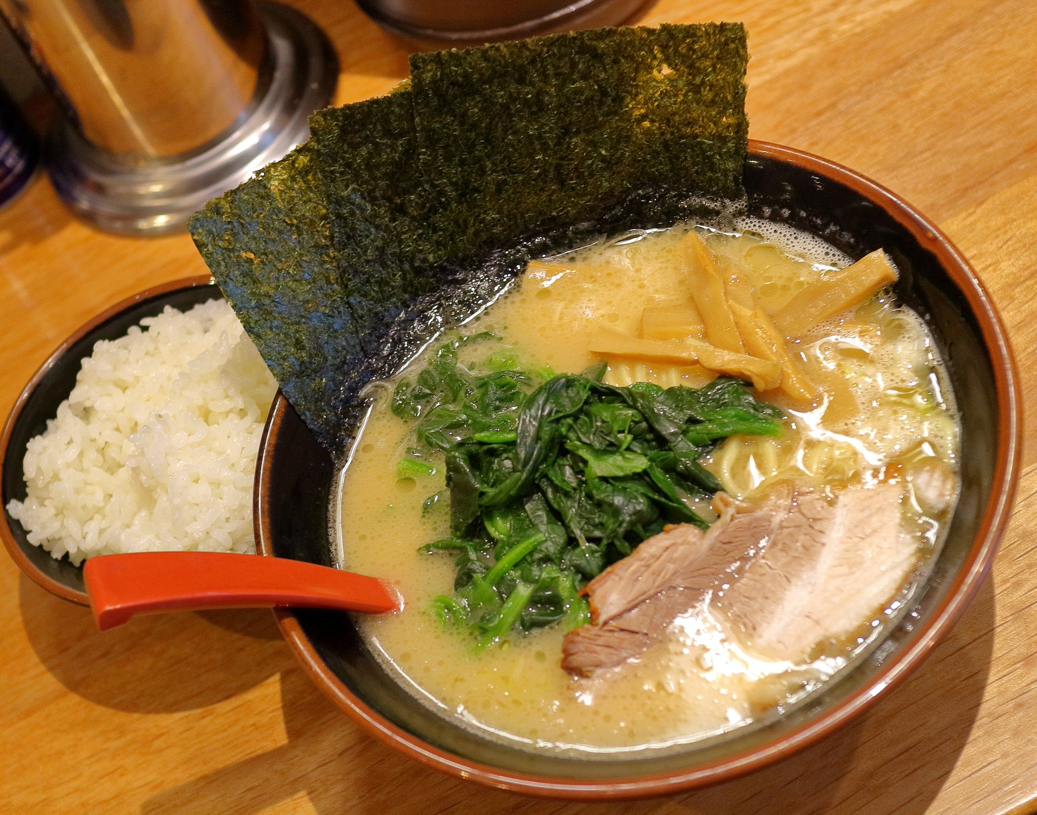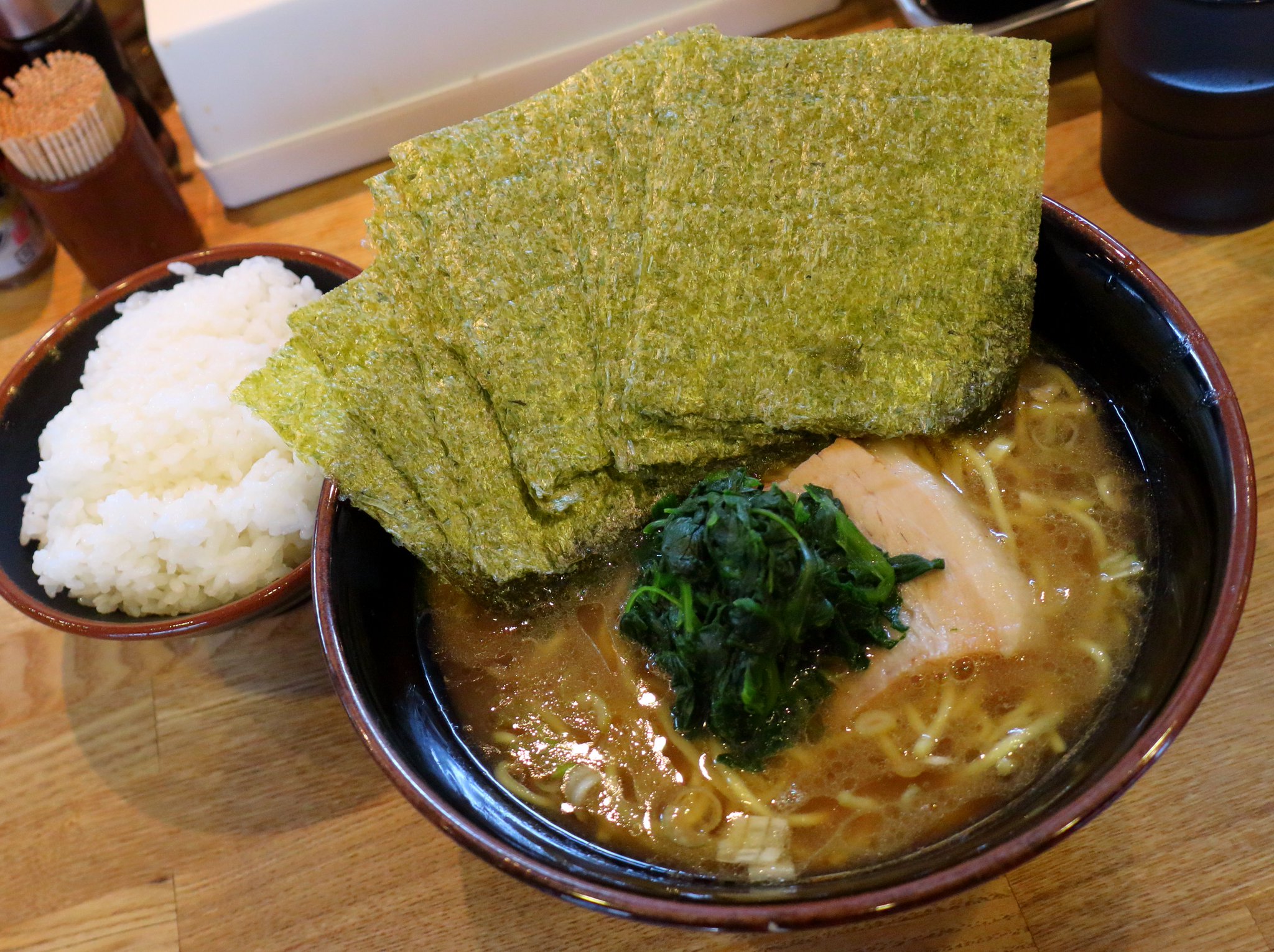 海苔は私が注文したのですが、店員が間違えて武田の子孫のラーメンに海苔マシされていました。しかたなく魚介醤油に乗っていた海苔を私のラーメンに移設してから写真を撮りました。 スープを飲んでみると若干薄めの豚骨醤油スープでした。最初は物足りなさを感じたようでしたがその後この味に慣れてきました。 海苔で麺を巻いて何度も食べました。味に飽きてきたので途中で刻み生姜と辛ニラを投入してしまいました。 そして麺を食べ終えてからは海苔でライスを巻いてブラックペッパーを振り掛けて食べたのでした。 武田の子孫評価:★★★☆☆(3.5) |