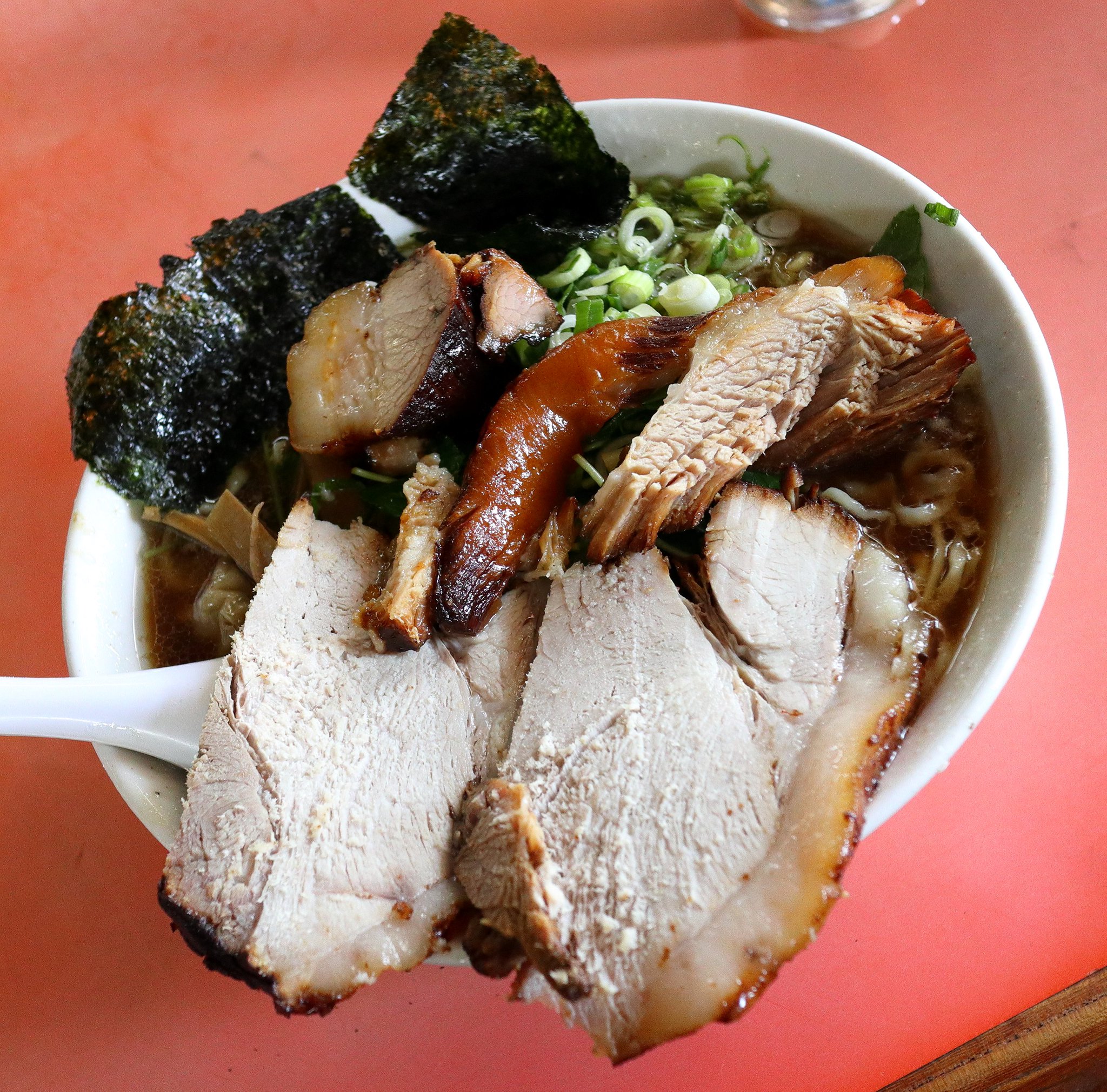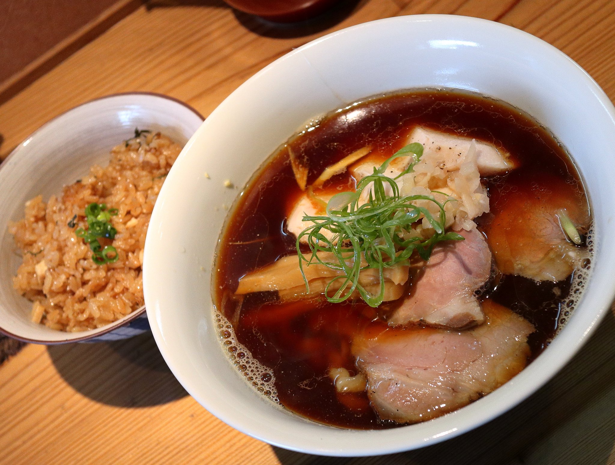 麺はビロビロした感じの麺です。2種類のチャーシューはジューシーで美味しかったです。それから炊き込みご飯も素晴らしかったです。 |