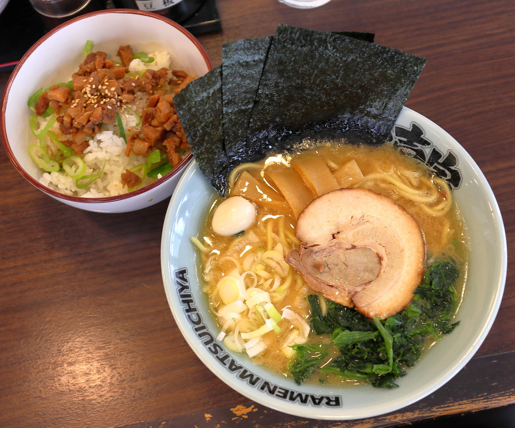 先にビールが出てきましたが、勢いよく飲むと酔ってしまうのでセーブしながら飲みました。そしてラーメンのセットが出てきました。メインは照り焼き丼で鶏塩ラーメンは小ラーメンでした。たまにはこういう感じもいいですね。 まずは温泉卵を潰してかき混ぜました。照り焼きは香ばしくて美味しかったです。ラーメンは確かに塩ラーメンでしたがおまけのような感じであまり良く分かりませんでした。 |