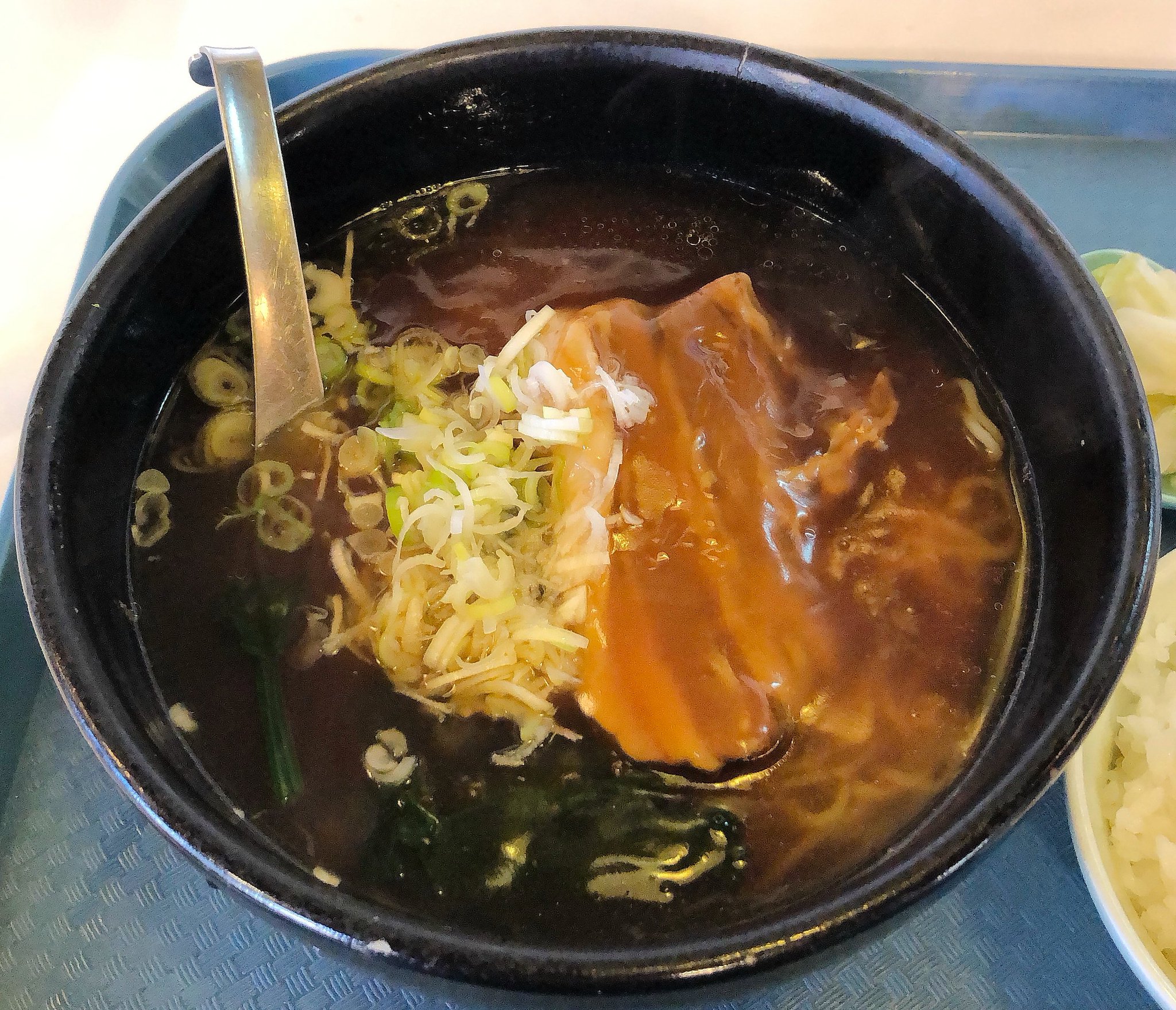 出てきたものは写真のようにあんかけ角煮醬油ラーメンといった感じでした。麺は細麺で美味しかったです。角煮も分厚くて満足できました。