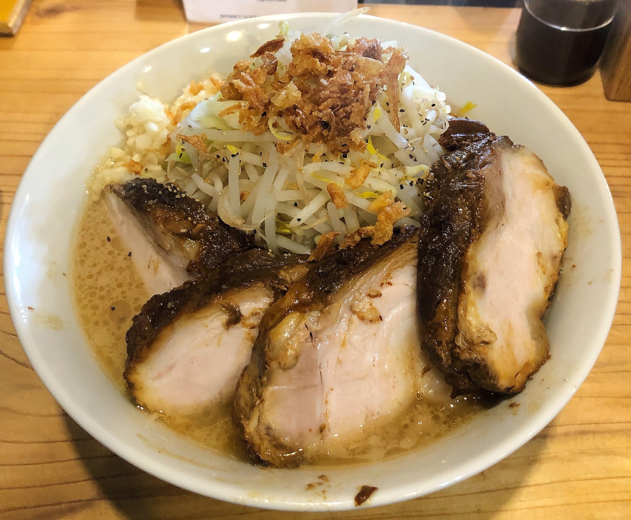 ラーメンはモヤシの山とそれを取り囲むように大きな肉が4枚入っていました。