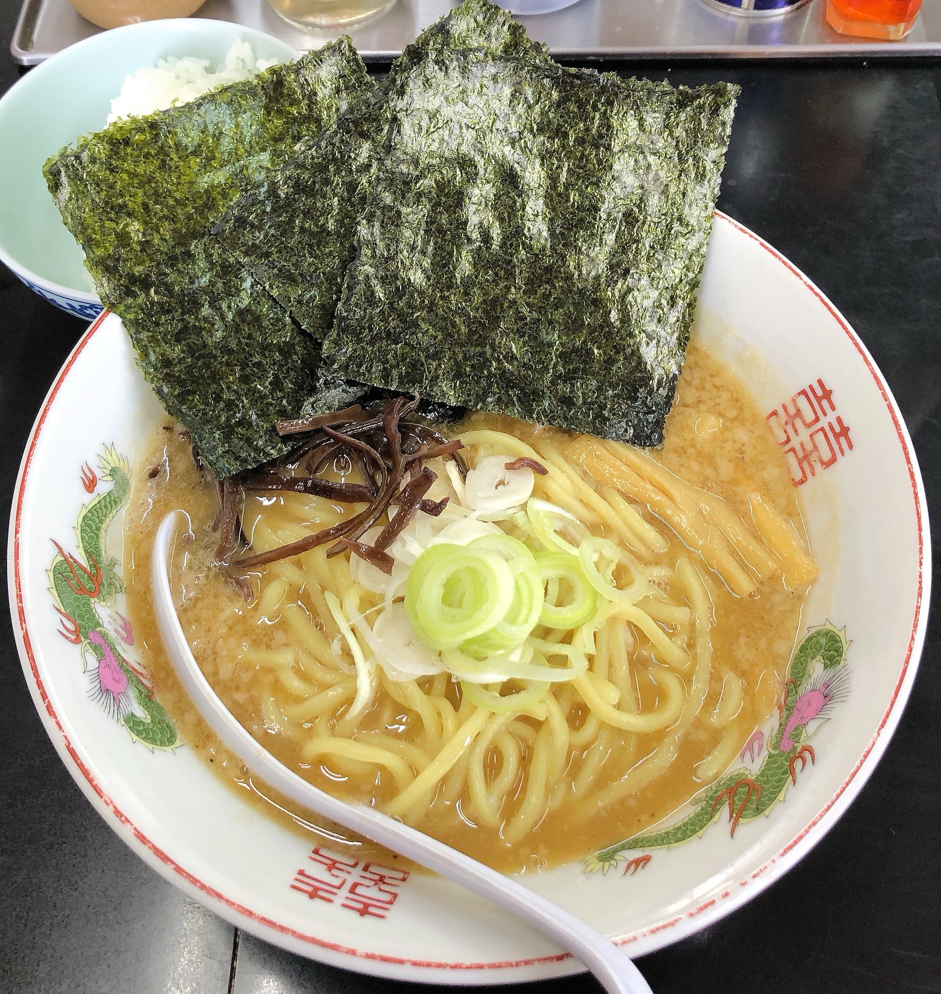 ラーメンは豚骨背油ラーメンでした。海苔とキクラゲ、シナチク、ネギが入っていました。ライスは普通。餃子は小さめでした。