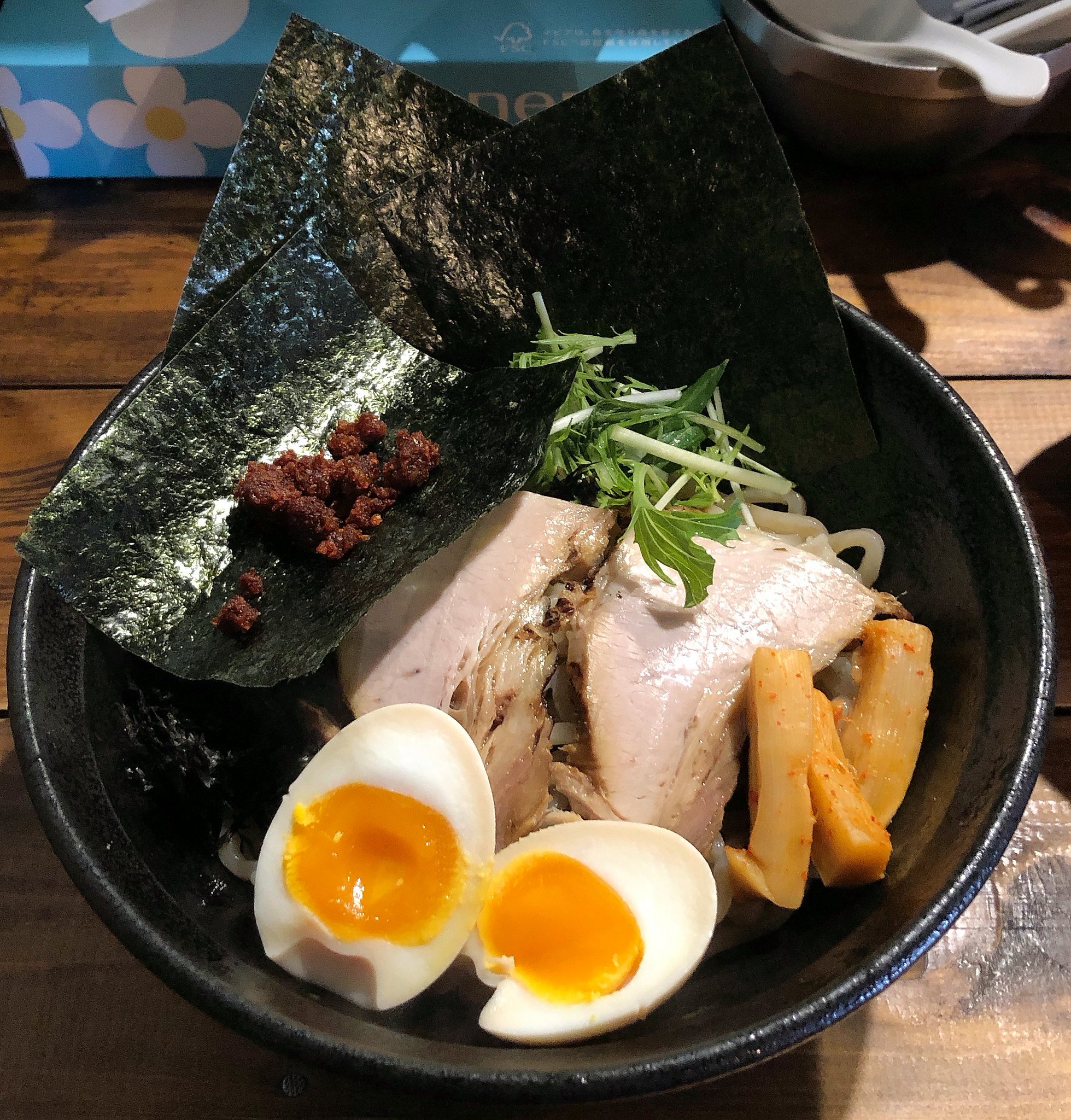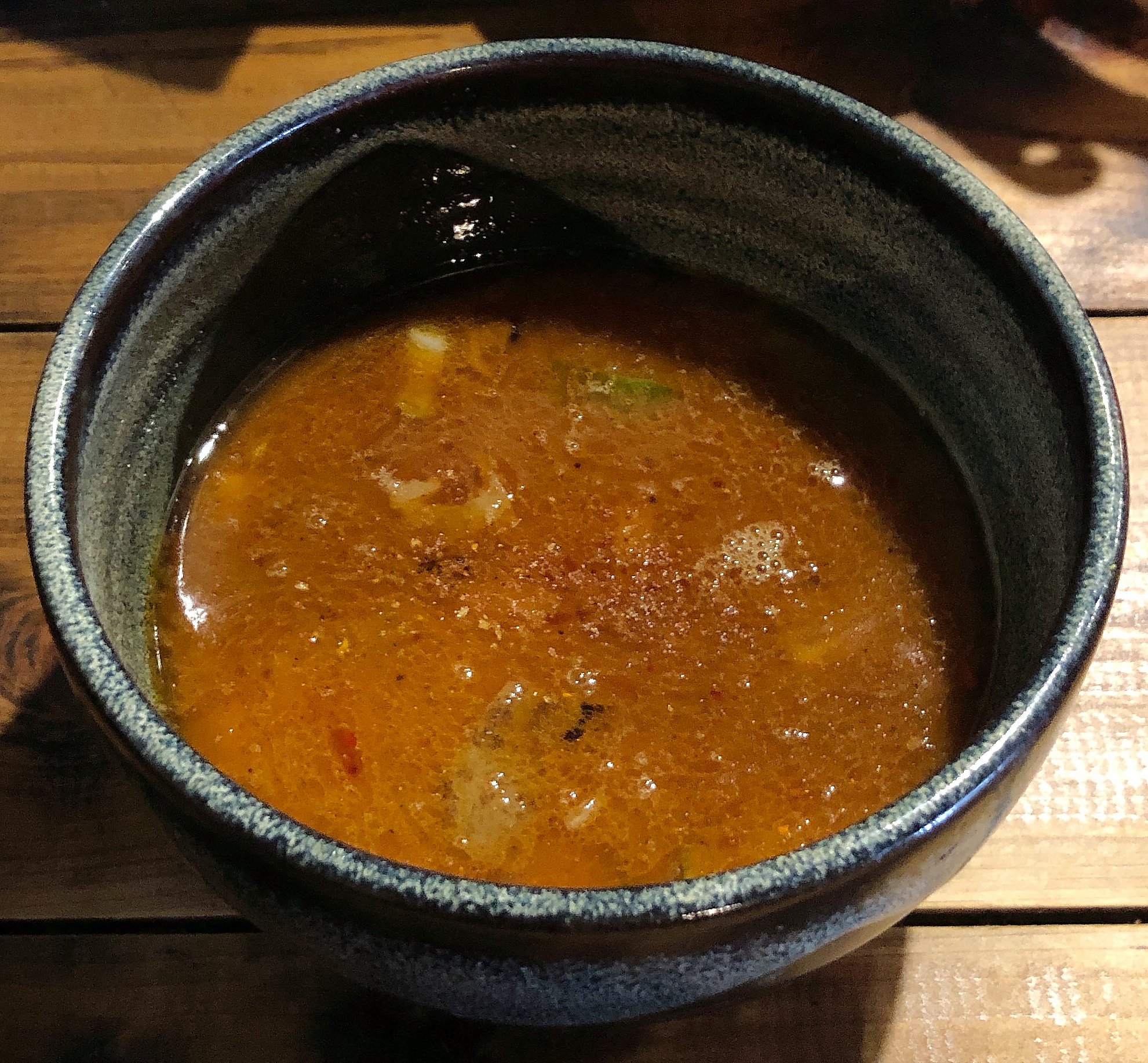 そしてつけ麺が出てきました。太麺を付けて食べてみましたが海老の風味を感じるピリ辛つけ麺でした。海老の風味は強くないのでしつこくありません。チャーシュー、煮玉子、シナチクも美味しかったです。海苔はそのままスープに入れてふやかしてからその上に麵を置いて巻いて食べたりました。