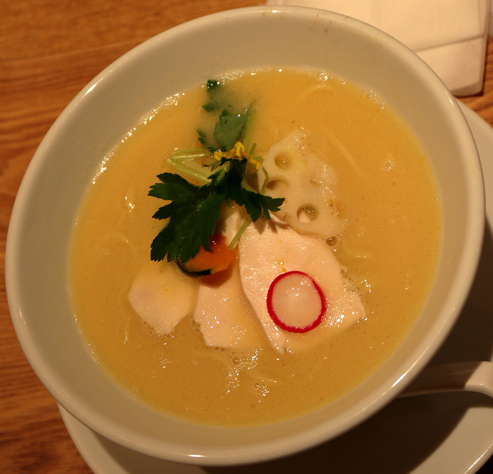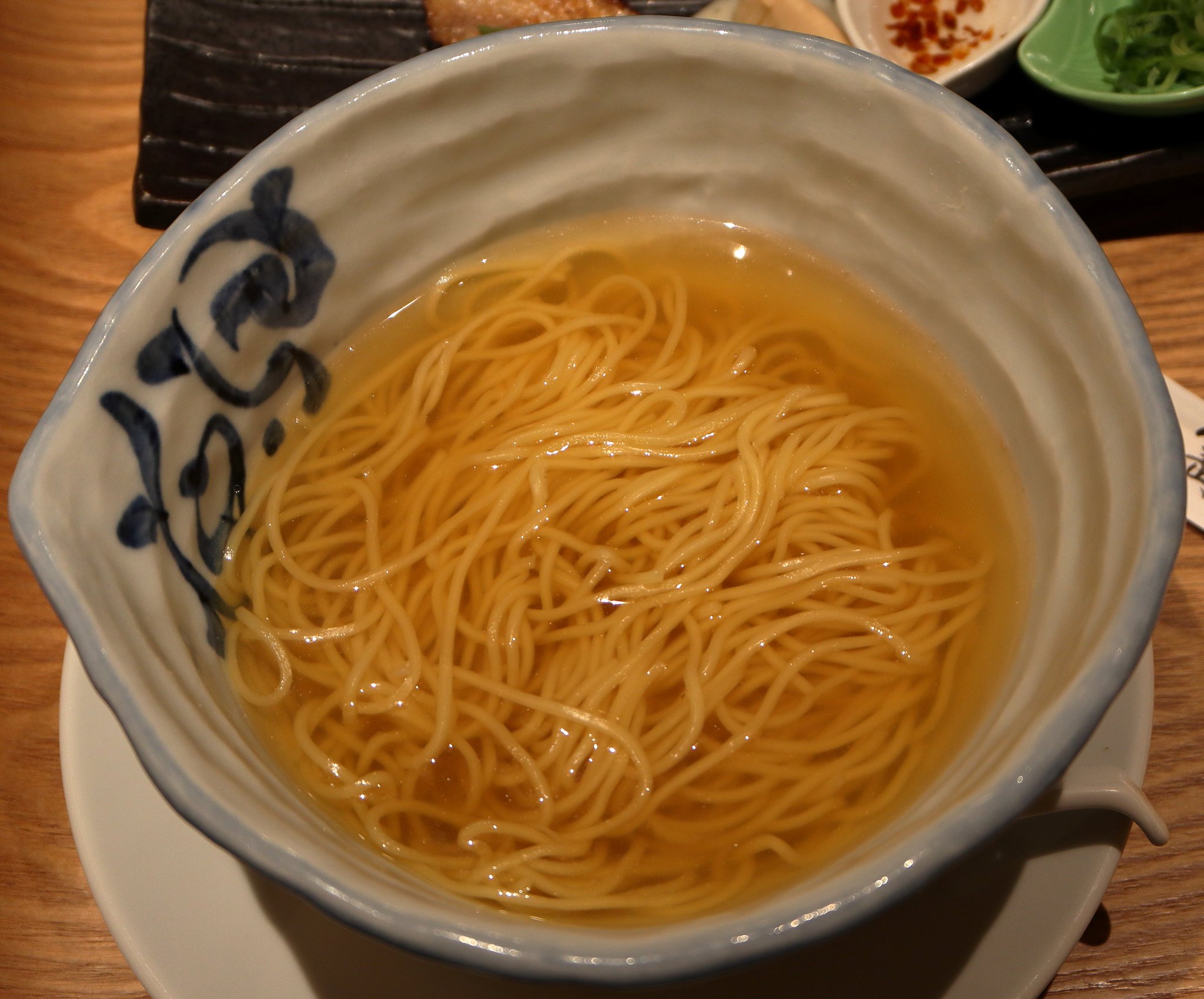 最初はスープと麺しかない状態です。スープは透明でサッパリしていましたが物足りない感じでした。その後別盛の具を順に投入してみました。確かに味が変わったと思いますが基本的に物足りない感じでした。