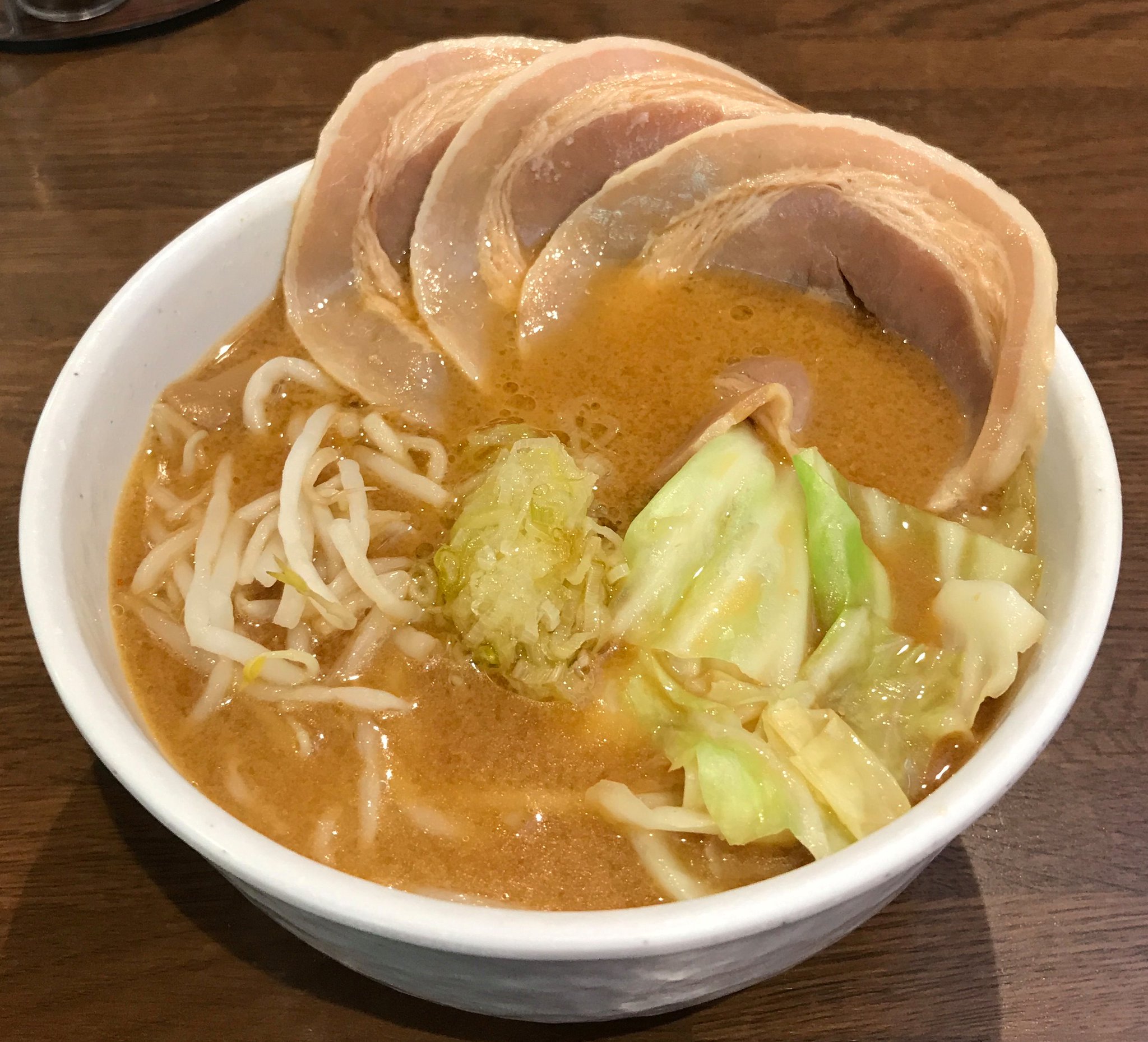 ラーメンは不自然なくらいすぐに出てきました。スープを飲んでみると今朝のカップ麺のような感じでした。麺は太麵、チャーシュー3枚。モヤシとキャベツが入っていました。