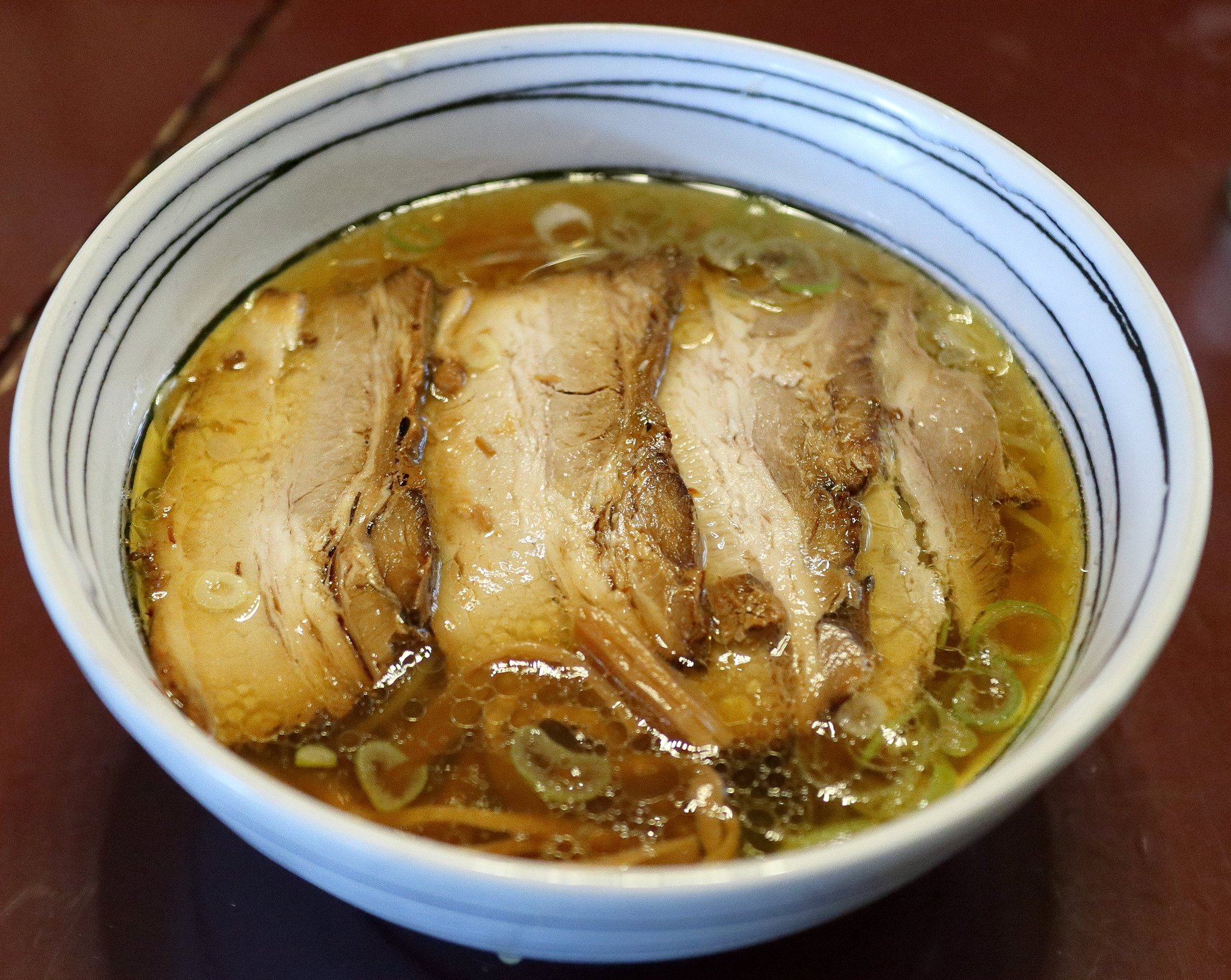 普通はまずスープを飲むのですが、チャーシューが美味しそうだったのでチャーシューから食べるという予想外の展開でした。チャーシューはトロトロで美味しかったです。スープは醤油味で甘さを感じました。史跡探索で疲れていたのでスープが体にしみ込んでいく感覚でした。麺は中太縮れ麺でスープがよく絡みました。