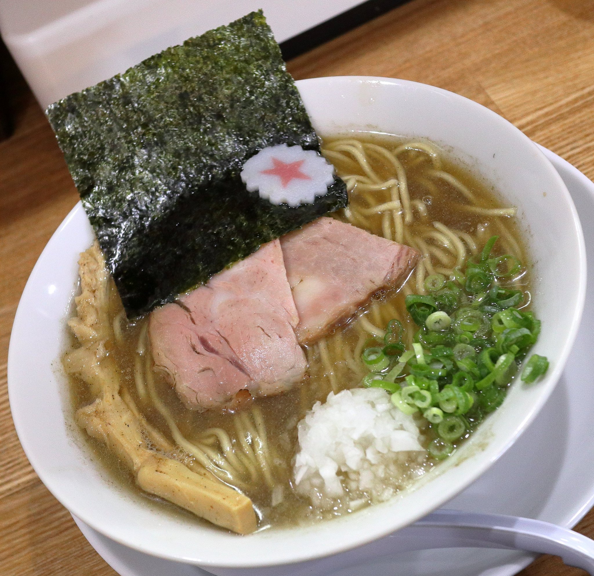 そしてラーメンが出てきました。★のナルトが印象的でした。長いシナチク、玉ねぎ、青ネギ、チャーシュー、海苔という構成です。