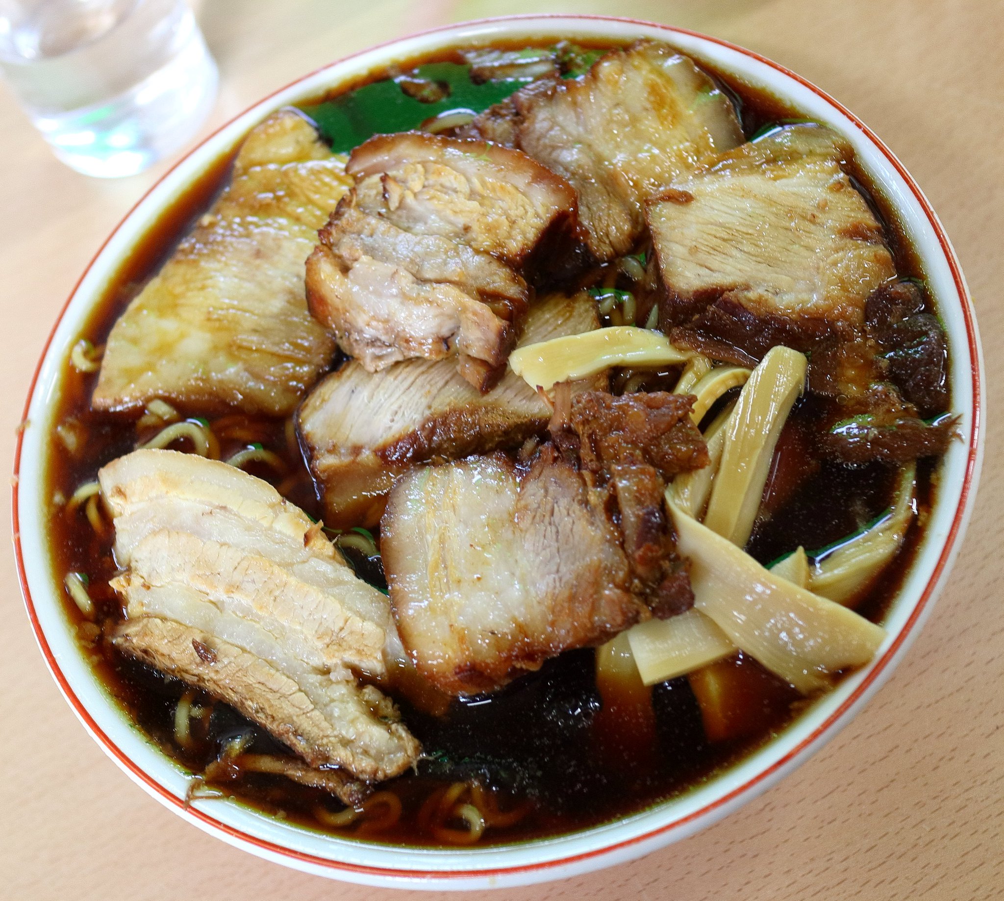 2015年05月09日昼その2 そしてしばらくしてラーメンが出てきました。チャーシューメンなのでチャーシューが沢山入っています。8枚だったと思います。まずはスープを飲んでみるとやや甘みを感じる美味しいスープです。そして麺を食べる前にチャーシューを食べます。このチャーシューが素晴しかったです。そして麺を引っ張り出して食べました。細めの縮れ麺でこれも良かったです。全部食べた後もレンゲでスープをすくうとチャーシューの肉片が拾えるので楽しかったです。 管理人評価:★★★★☆ |