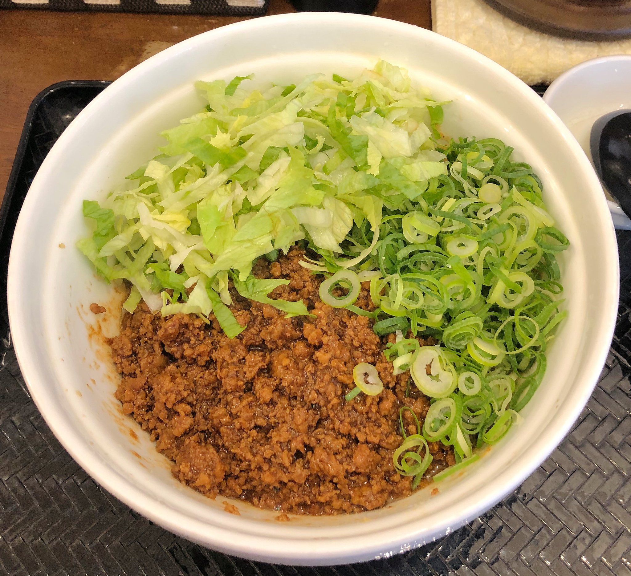 場所は湯島天神の向かいです。11時半頃に行ってみたのですが誰もいなくて一番乗りでした。券売機でメニューを確認して汁なし担担麺210g+温泉玉子:1000円の食券を買って店主に渡しました。すると辛さを聞かれたので返答に困ってしまいました。辛さにどういうレベルがあるのか聞いてみたら1〜4まであるとのことだったので4でお願いしたら、かなり辛いが本当に大丈夫か?と聞かれたので1に変更しました。