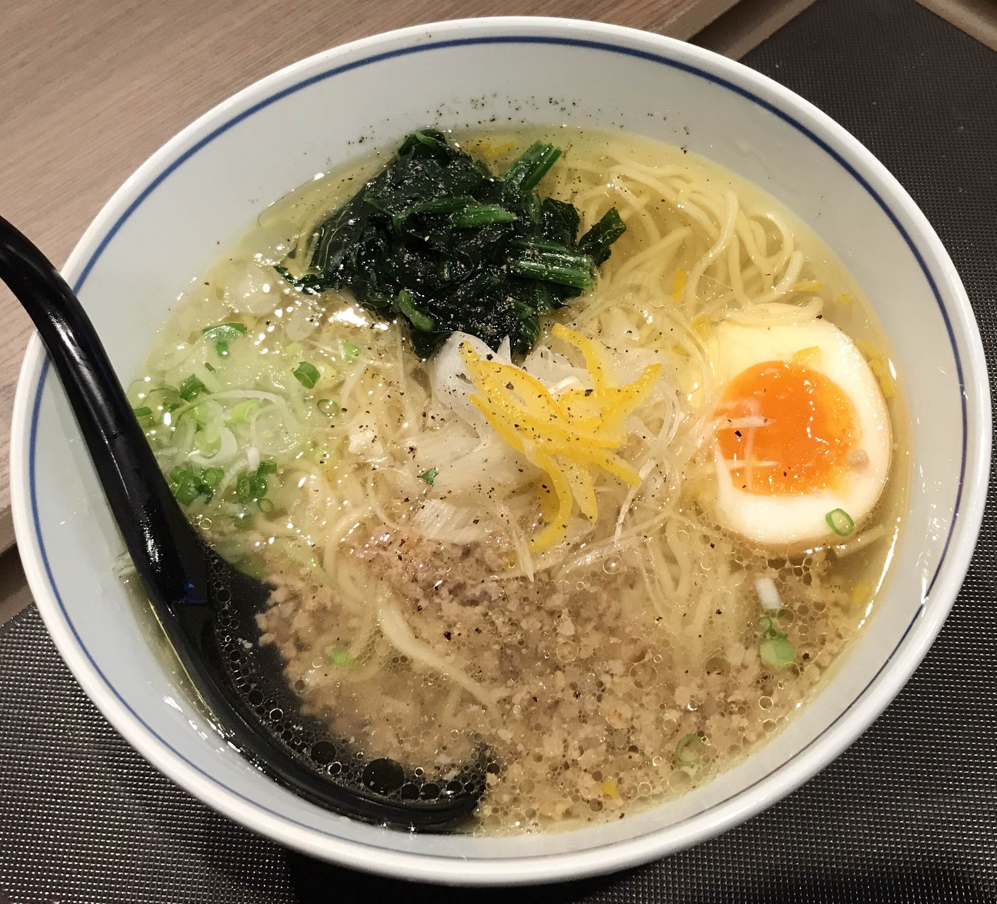 私の鶏ゆず塩ラーメンは柚子の香りを感じることができる美味しい塩味のラーメンでした。サッパリしているのにコクがある柚子塩です。麺は細麺でした。肉も入っていて満足できました。