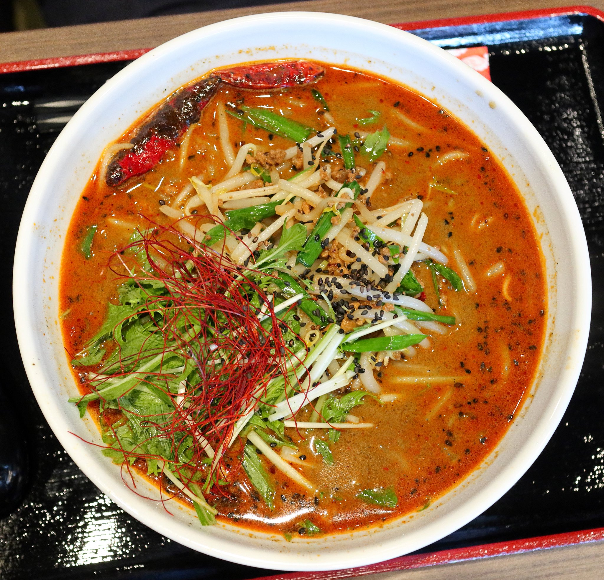 ラーメンはすぐに出てきました。今回は真上から撮影してみました。私のマーボー麺はいかにも辛そうな感じでした。恐る恐る麺を引き出して食べてみると実は見た目ほど辛くありませんでした。麺は両方とも同じ麺のようでした。私のマーボー麺は当たり前ですが豆腐が沢山入っていました。万人向けのラーメンだと思いました。