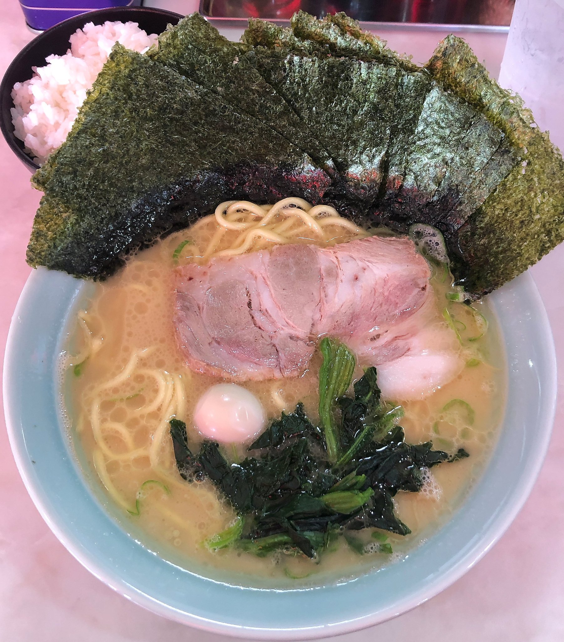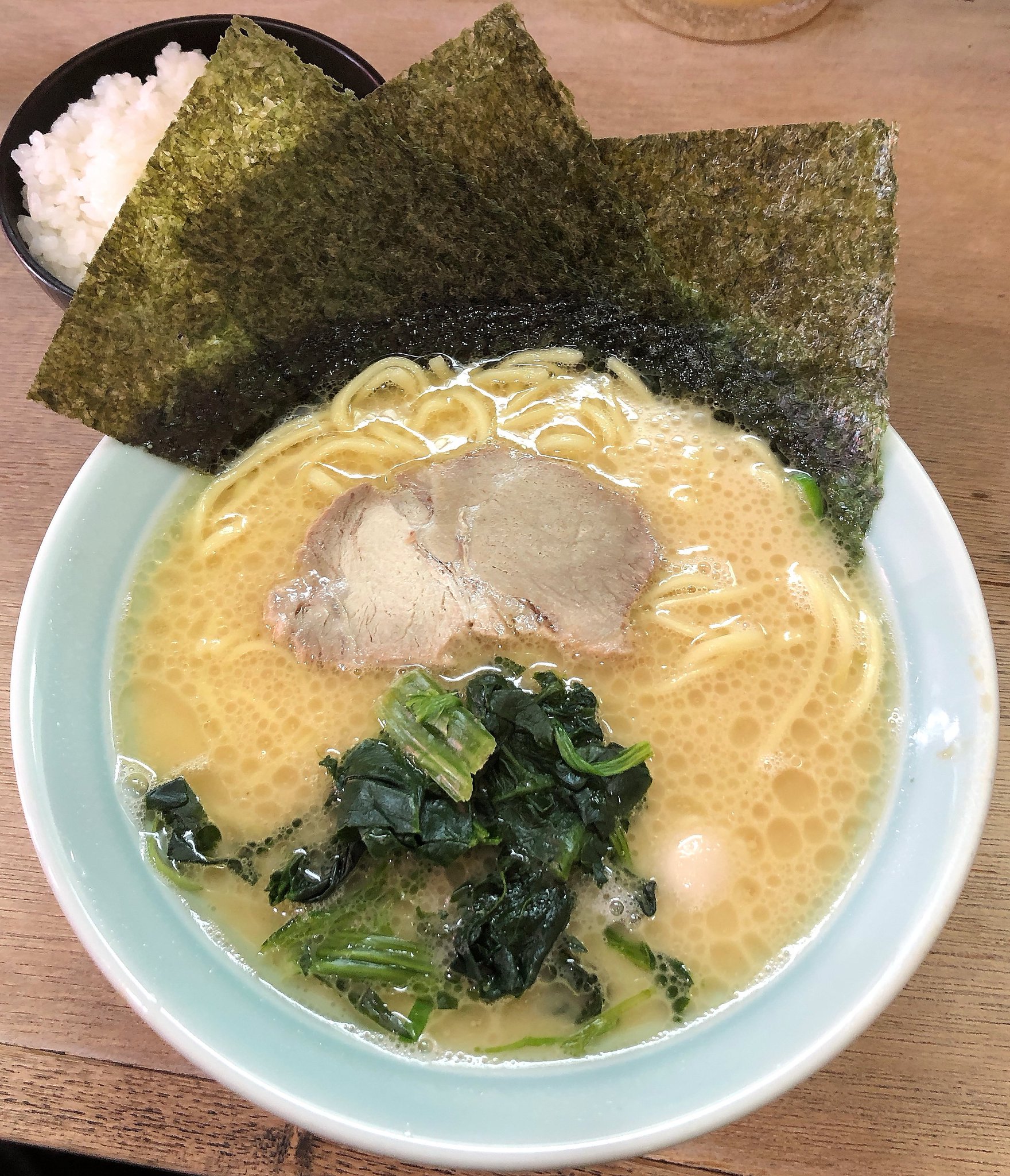 海苔をスープに沈み込ませてからチャーシューも麺の下に挿入しました。スープを飲むと美味しい塩豚骨です。私と塩豚骨との出会いは大船の壱六家だったことを思い出しました。麺は普通で注文しているので普通のかたさでした。これでいいと思いました。麺を半分くらい食べてから、海苔でライスを巻いて食べました。壱六家系の海苔は最高です。海苔にはコショウを振り掛けることも忘れません。3回ほど巻いて海苔がなくなり、最後はライスはそのまま少しずつ食べながらスープも飲みました。ライスにスープをかけるよりサッパリと食べることができていい感じです。その後残った麺も食べて、スープもほとんど飲み干してしまったのでした。 |