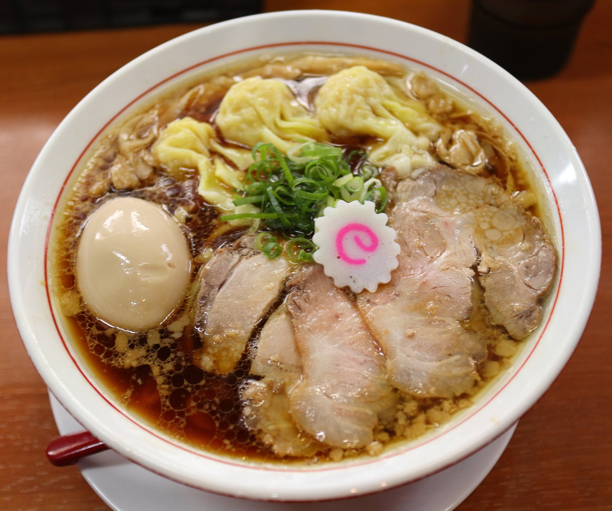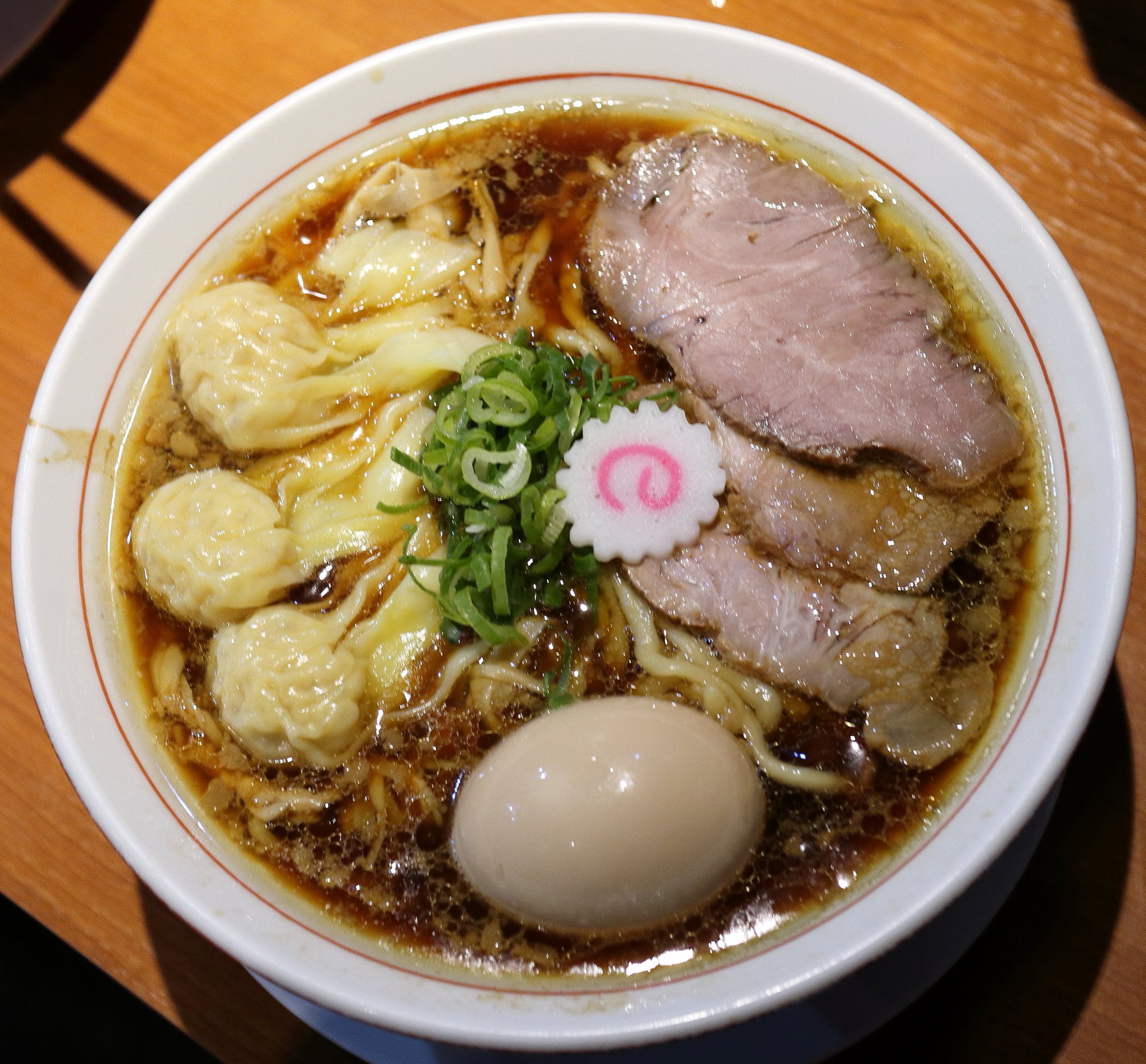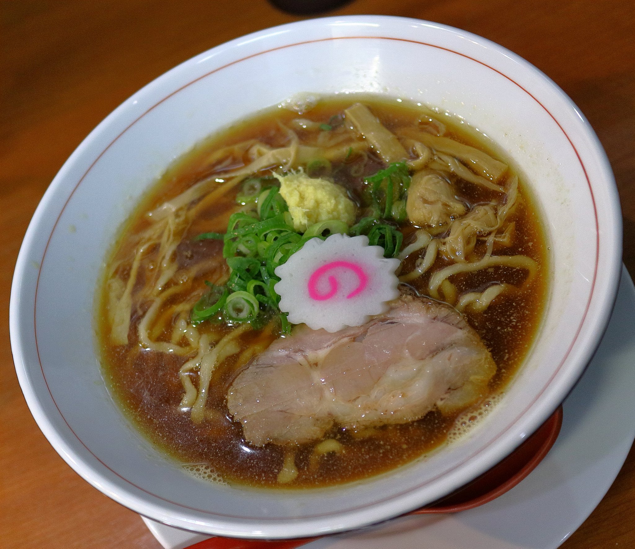 そしてあまり待つことなく上の写真のようなラーメンが出てきました。中央になると、それに味玉、チャーシュー、長いシナチク、スープは濃い醤油味で尾道ラーメンから背脂を取ったような感じのスープでコクがありました。麺は平縮れ麺でした。