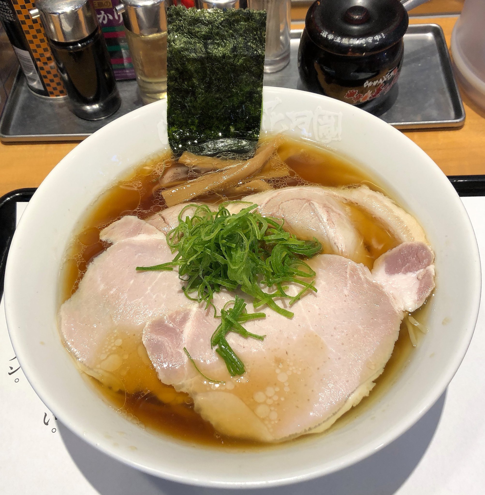 お店は西口に出て少し北上した所でした。空いていました。券売機でメニューを確認したら、飯田商店醤油らぁ麺のボタンが2つあって金額が1100円と1300円になっていました。違いが良く分からなかったので店員に聞いてみたら1100円がスタンダードで、1300円の方がチャーシューメンでした。ということで飯田商店醤油チャーシュー麺:1300円の食券を買って店員に渡しました。