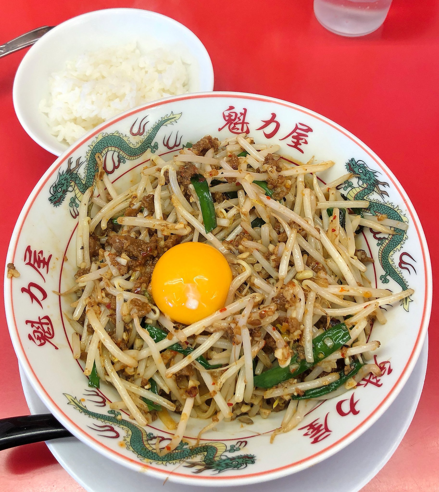 汁無台湾麺はまず卵の黄身を潰してから良くかき混ぜて食べました。ピリ辛でモヤシが沢山入っていて麺は平打ち麺のような感じでした。麺を食べ終えた後は追い飯を投入して食べました。半額焼きめしも量がちょうどいい感じでした。