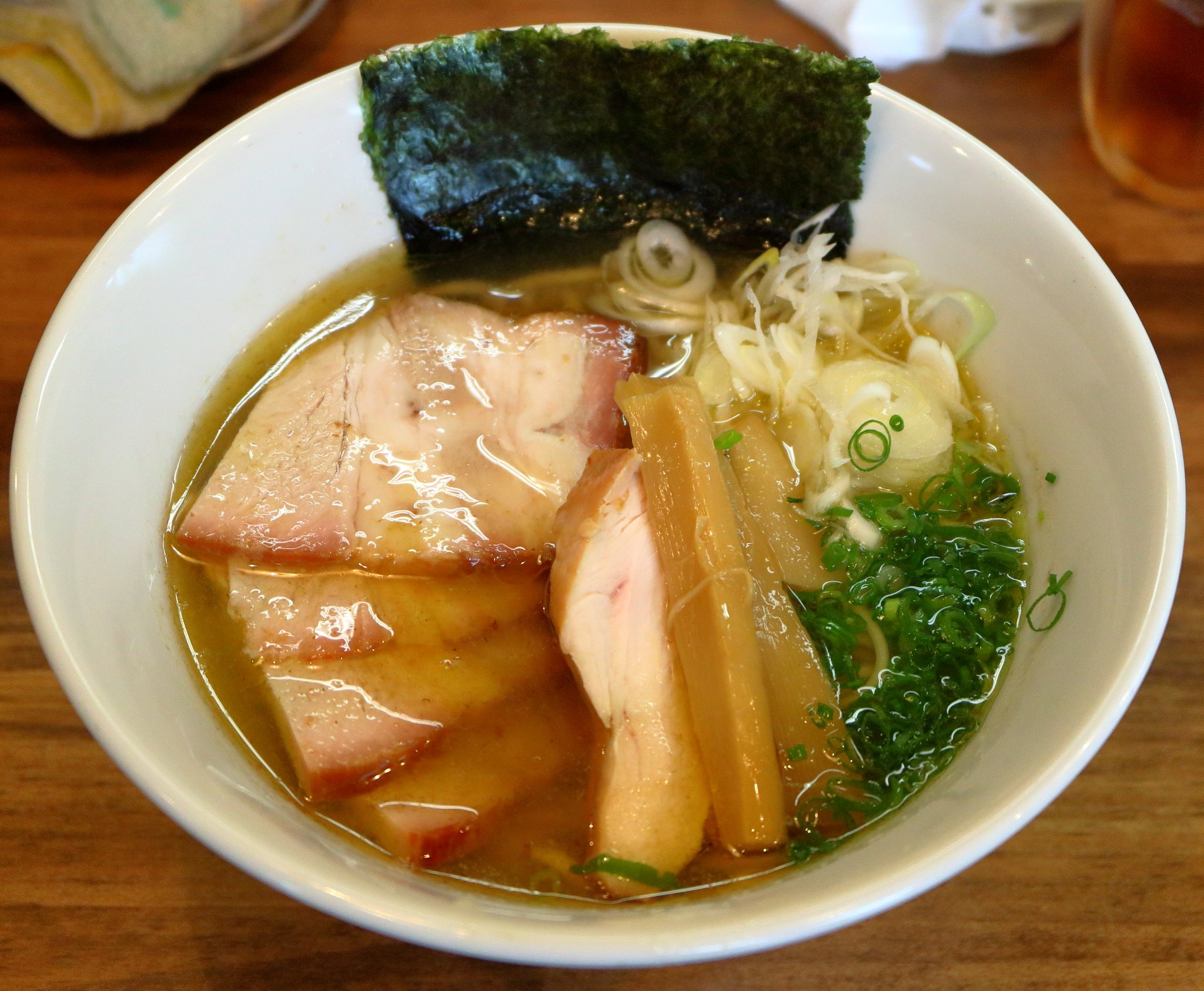 カミカゼに並んでいる時から隣にあるまるもり製麵が気になっていました。カミカゼには大行列ができていますが、まるもり製麵は行列はできていません。2軒目で寄ってみようと思っていました。カミカゼで塩ラーメンを食べた後に外に出たら雨が降っていました。そしてそのまままるもり製麵へ。行列はできていませんでしたがほぼ満席でした。券売機で一番左上にあった正油ラーメン:690円の食券を買って店員に渡しました。私が座った席がクーラーから一番遠かったので暑かったです。そしてラーメンが出てきました。底が深い器でおしゃれな感じでした。