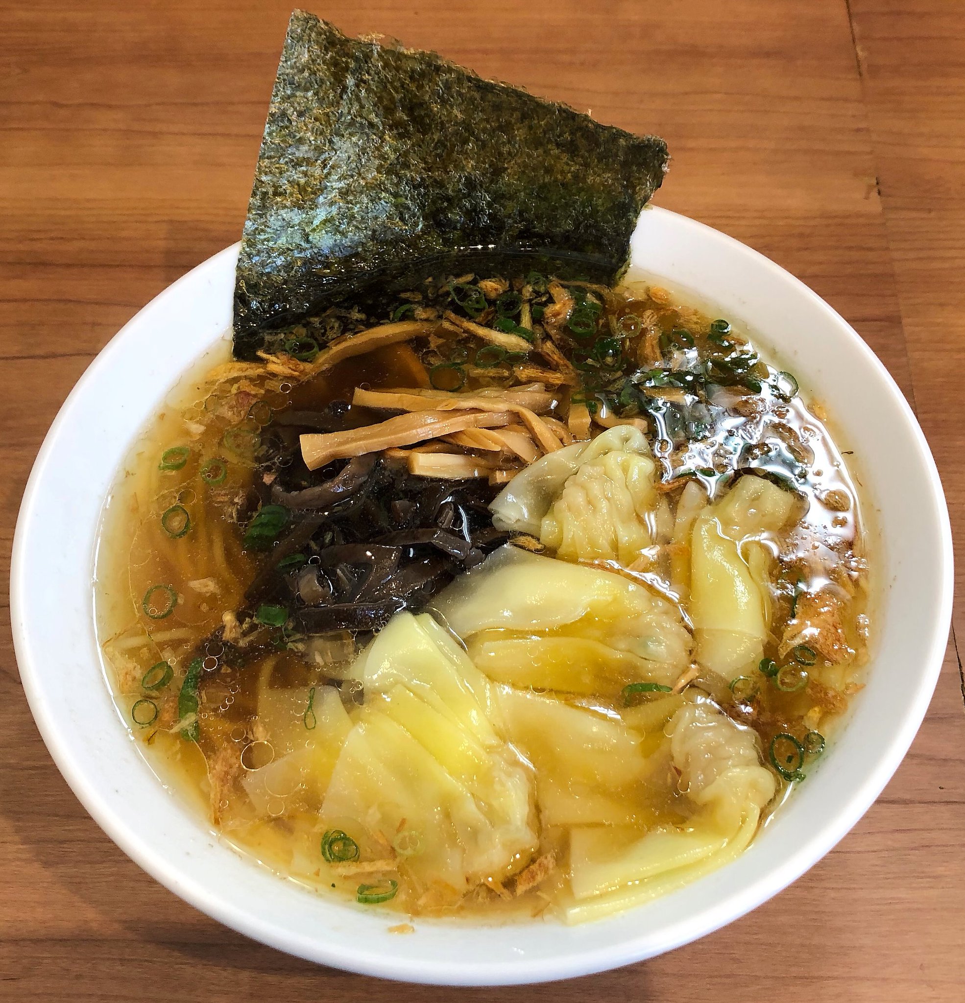 スープを飲んでみると醤油味でしたがあまり印象に残らない感じでした。麺はツルンとした中太ストレートでした。キクラゲが印象的でシャキシャキしていました。肉ワンタンは熱くてゆっくり噛むことができず肉を楽しむことができませんでした。