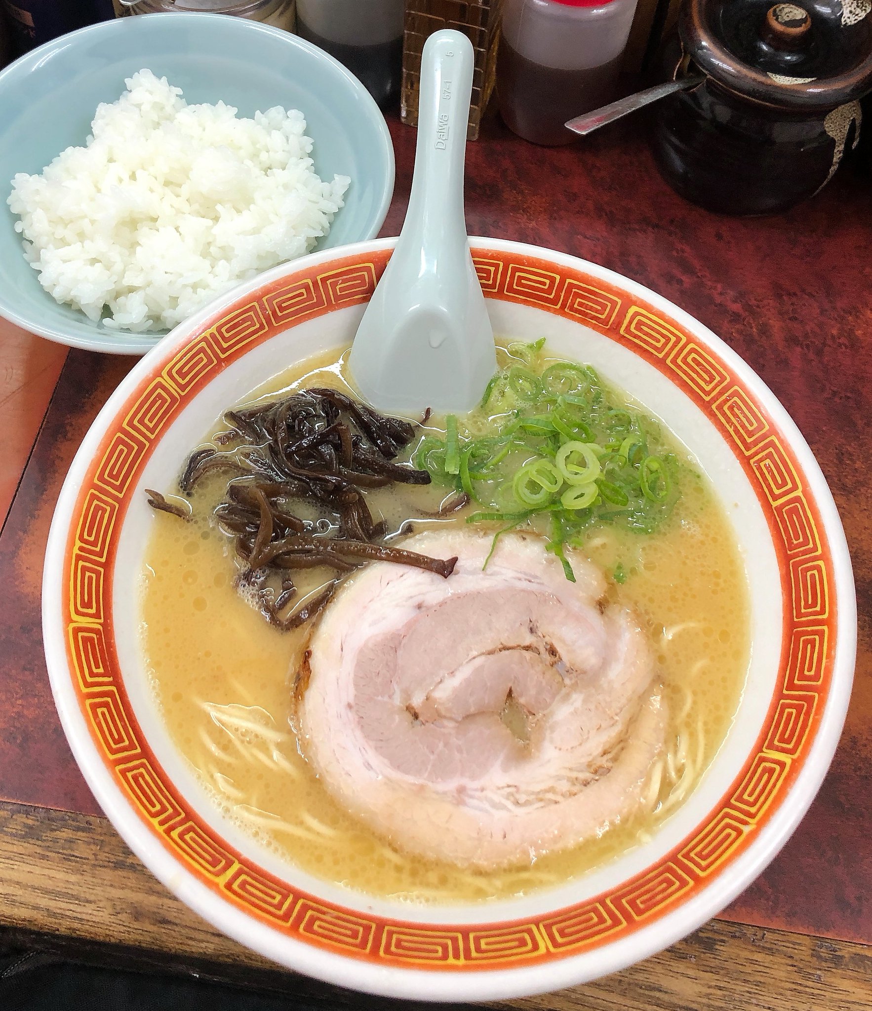 今日は体調が良くなく家で寝ていました。妹が風邪をひいているようで咳をしていたのできっとうつったのでしょう。しかしこういう時こそラーメンを食べて元気を出さなければ!と思って無理して出かけることにしました。永田から大池に向う途中に見つけた気になるラーメン屋を目的地にしました。今日も外は暑いですね。車の温度計は35℃になっていました。現地に行ってみると今日は休みでした。月曜日は休みのラーメン屋が多いですね。次の候補地は長浜家でした。なんと長浜家には駐車場がありました。ちょうどラーメン屋の裏側でした。店に入ると一番手前の席に座りました。メニューを見ると博多ラーメン、豚骨醤油、味噌、支那そばなどいろいろな種類のラーメンがありましたが私は博多チャーシューめん:800円を注文しました。博多ラーメンは本場博多長浜の白湯とんこつスープ、麺は特製極細麺とのことでした。白湯とのことでしたので真っ白なスープを想像していましたが上の写真のとおり普通の色の豚骨スープでした。しかしスープは少しクセがあって普通のラーメン屋とは違う感じでした。これこそ博多本場のスープなのでしょうか?ネギやワカメも入っていたのが特徴的でした。そして特製極細麺が物凄くコシがあって噛みごたえがありました。麺の硬さは普通で十分だと思います。そしてチャーシューですが分厚くてしっかりしたチャーシューがたくさん入っていました。九州のラーメンの弱点はチャーシュー?と思っているのですが、ここのラーメンのチャーシューは九州ラーメンの割りにはご立派でした。全体的に食べごたえがあるラーメンで十分に満足できました。これで風邪もなおることでしょう。 |