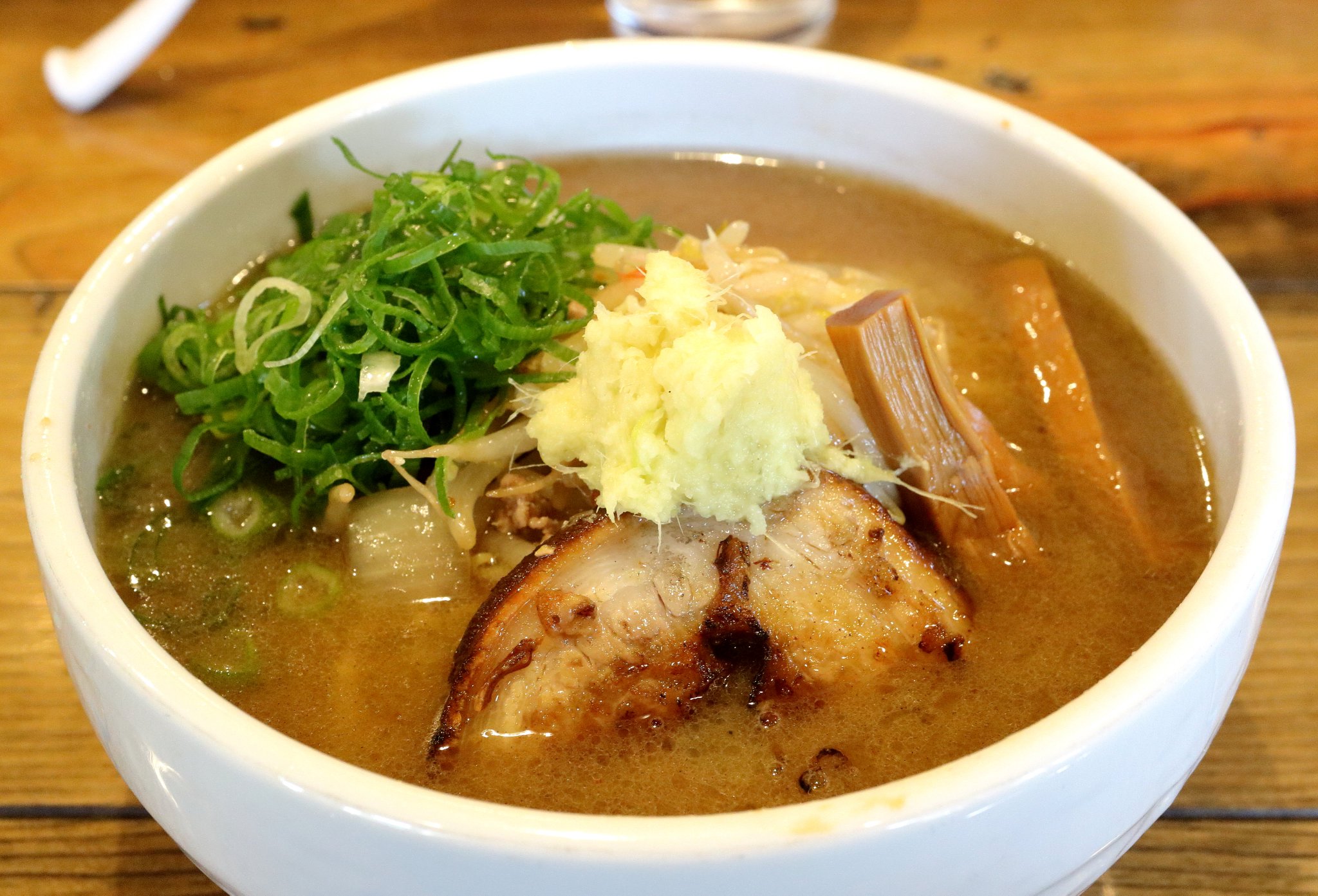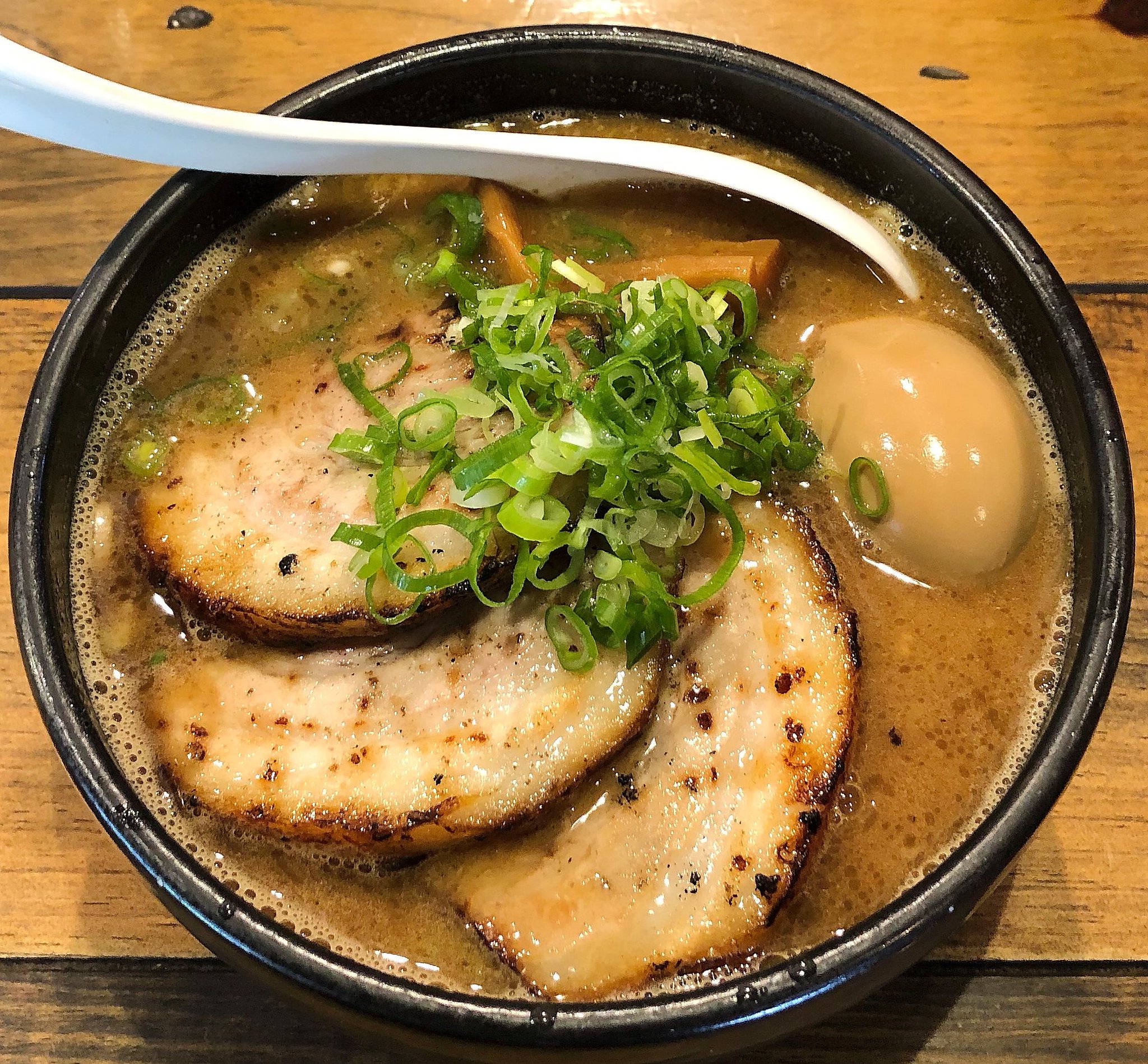 2008年02月02日昼 今朝起きたら顔がむくんでいて体重が2kg近く増えていました。昨晩の初代けいすけのブラックカリー麺がよっぽど濃かったのかもしれません。掲示板でラーメン探検隊殿に紹介してもらっていた麺匠るい斗に行ってきました。ラーメン本舗の隣とのことでしたので現地付近まで行ってみたら場所はすぐに分かりました。駐車場もお店の裏にありました。お店の前にはオープンの花輪?がありました。だれも並んでいなかったのですが、店の中に数名いたようです。私も無理やり潜入して食券を購入しました。味玉塩チャーシュー:1050円です。そこから一旦外に追い出されてしまいました。そのうち行列ができ始め、7,8人並んでいました。その後すぐに順番が来て店の中に入ってみるとすぐに席に座ることができました。チャーシューを炙っていました。焼いているところを見せる効果とにおいの効果がありますね。食券を渡してラーメンを待ちました。器をお湯で温めていました。思ったより早くラーメンが出てきました。炙りチャーシューが4,5枚、玉子、ネギなどが入っていました。まずスープを飲んでみると確かに塩味の美味しいスープでしたがちょっと薄いかな?と思ってもう2くちくらい飲んでしまいました。麺は中太の平麺でこれは良かったです。玉子も柔らかすぎずちょうどいい半熟度の美味しい玉子でした。一番印象的だったのはやっぱりチャーシューでした。柔らかくていい香りがして素晴らしかったです。その後レンゲを使うのをやめてスープを飲んでみたのですが器暖め効果のためスープがアツアツで舌が少し麻痺してしまったかもしれません。私は専門家ではないのでよくわかりませんが、スープが熱すぎて味が薄く感じてしまうのでしょうか?それとも昨晩の濃いラーメンの影響が残っていたのか?いずれにしてももう少し塩味が強ければ最高だったと思います。店を出るころはちょうどお昼頃でしたが、もう行列はできていませんでした。