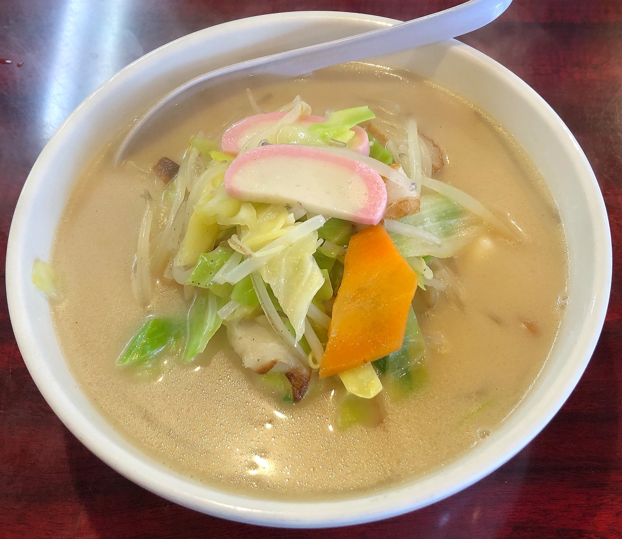 スープを飲んでみるとややサッパリしたチャンポンのスープでした。そして麺ですが、長崎ちゃんぽん独特の太めでふにゃふにゃした麺で、私はこれが大好きなのです。野菜は沢山入っていてボリューム満点でした。