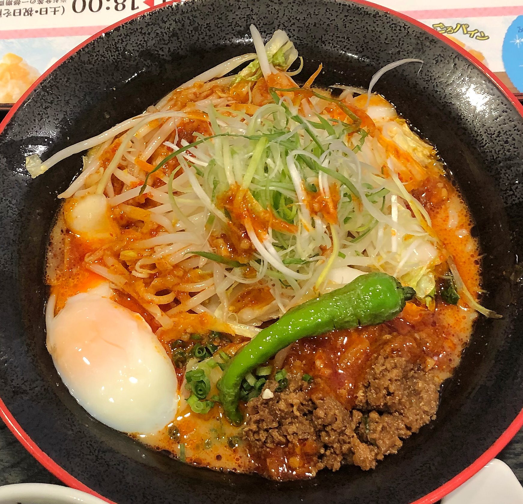 あまり待たずに赤旨冷やし担々麺セットが出てきました。温泉卵が入っていましたがこれも潰してよくかき混ぜました。ピリ辛で美味しかったです。麺は中華麺ではないような感じの平打ち麺でした。野菜と肉がたっぷり入っていて良かったです。