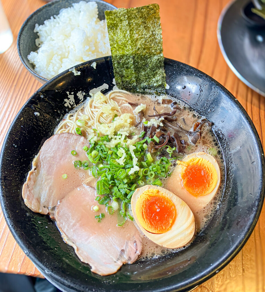 ラーメンが出てきてからニンニクを潰して入れて更に辛子高菜も投入。美味しい豚骨ラーメンでした。ご飯もあったせいか麺の量もちょうどよくて替え玉はしなくても満足できました。
