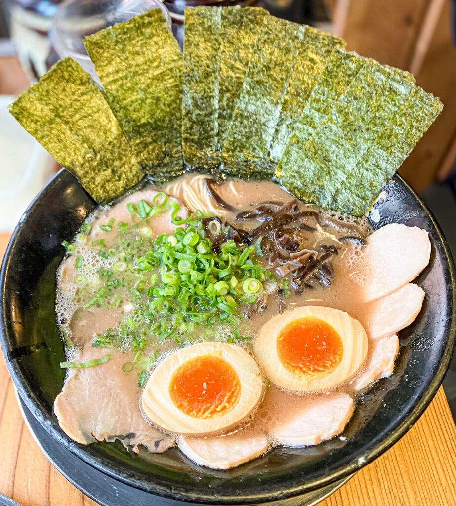 私は半熟味玉ラーメン:1050円、ライス:100円で麺はバリカタ(写真上)、西田氏は全部入りの特製豚骨ラーメン:1250円、博多一口餃子5個:330円(写真下)の食券を買っていました。